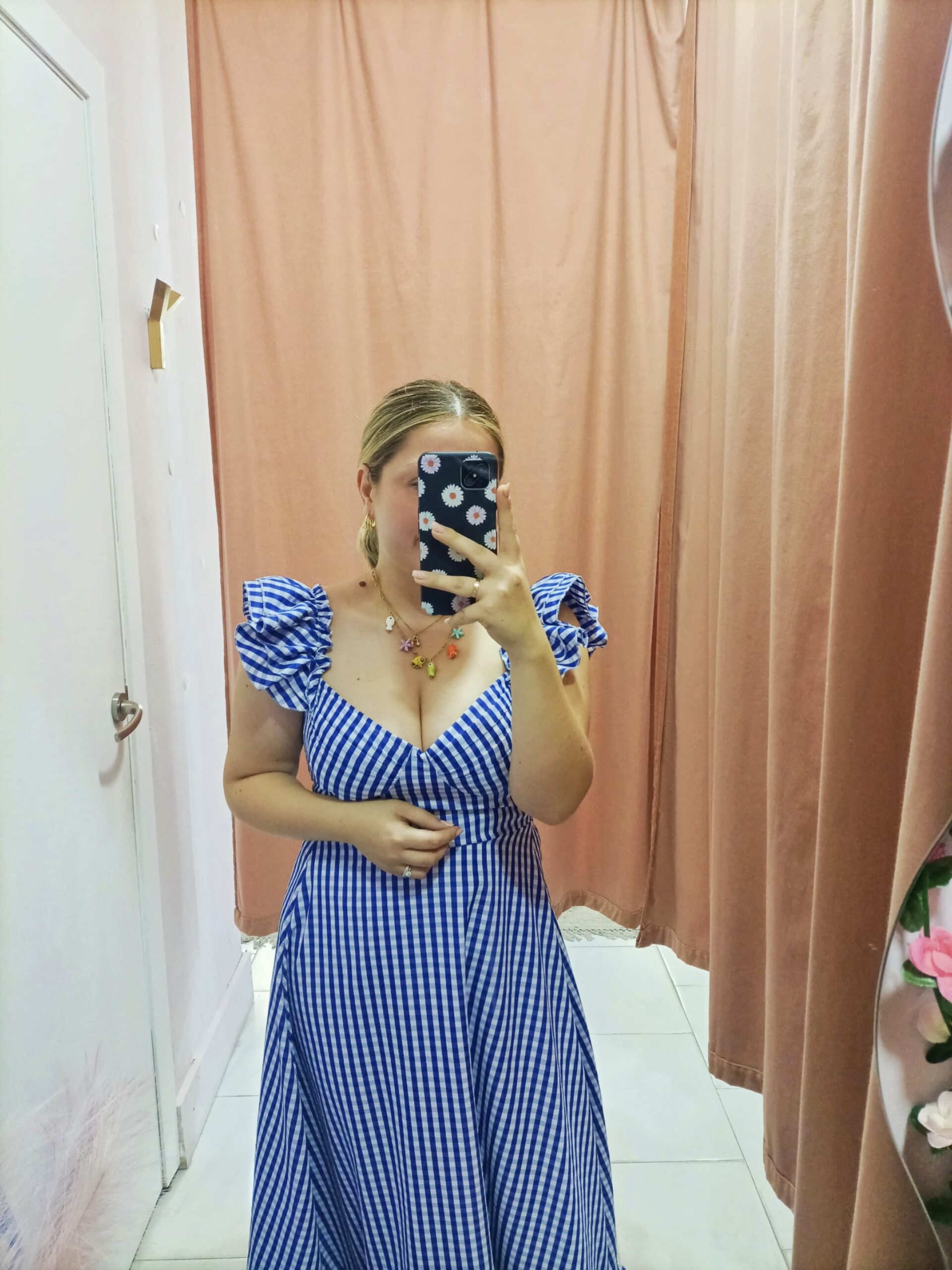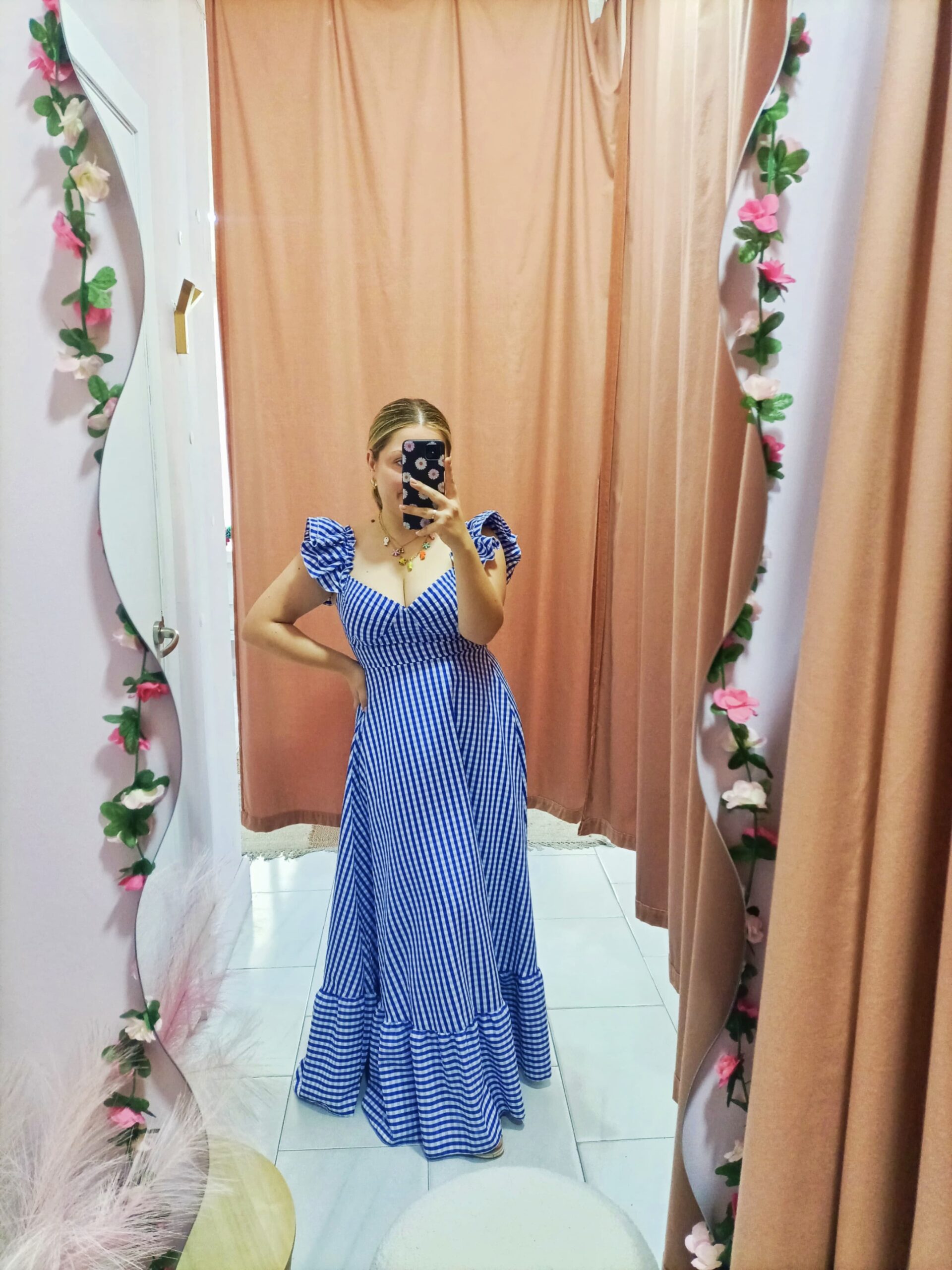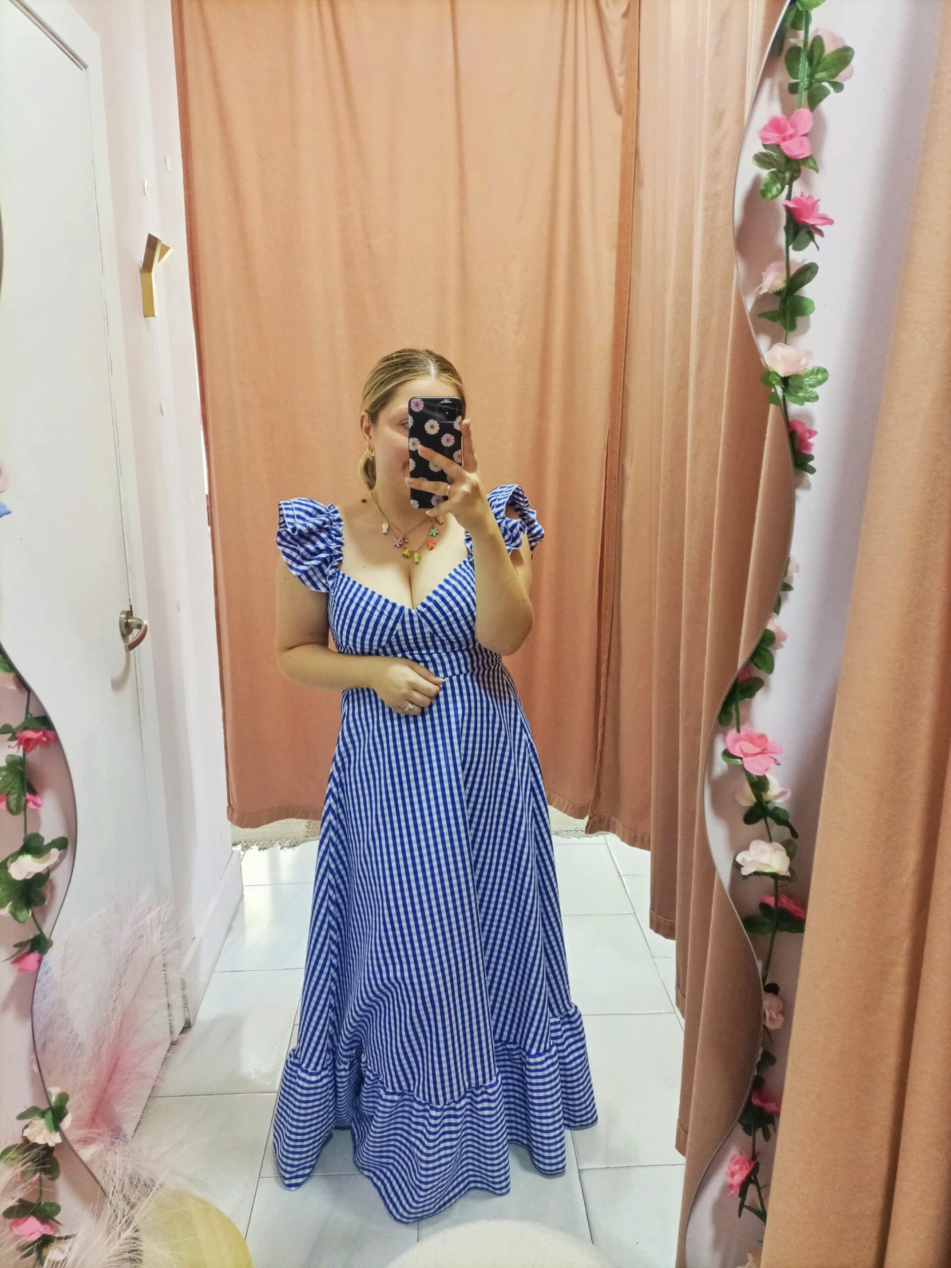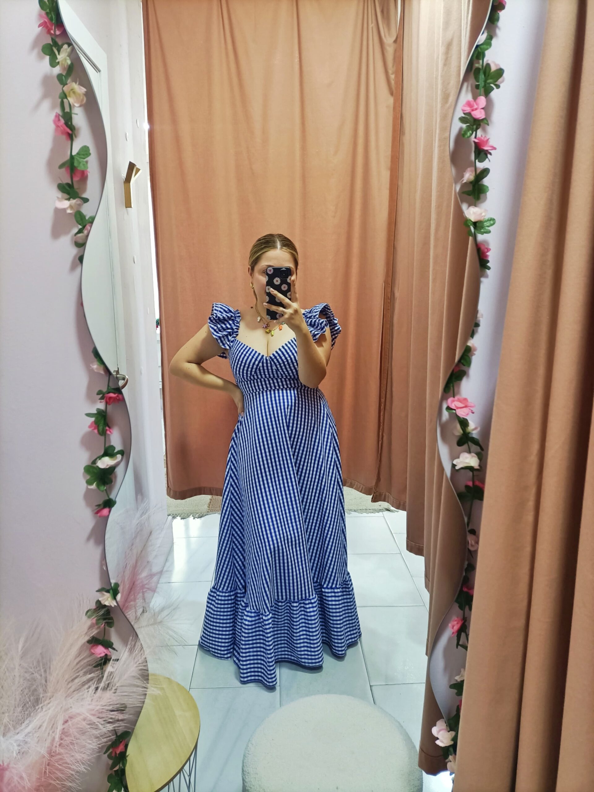 Bata rociera con estampado de cuadros vichy en color azul y blanco. Falda con vuelo y volante bajo, escote en forma de corazón con volantes en los hombros. Espalda con tejido elástico de nido de abeja. El vestido da bastante talla y se ajusta muy bien al cuerpo. Opción de usarlo también como vestido de verano. ¡Llévate nuestro piquillo blanco perforado y dale un toque especial!