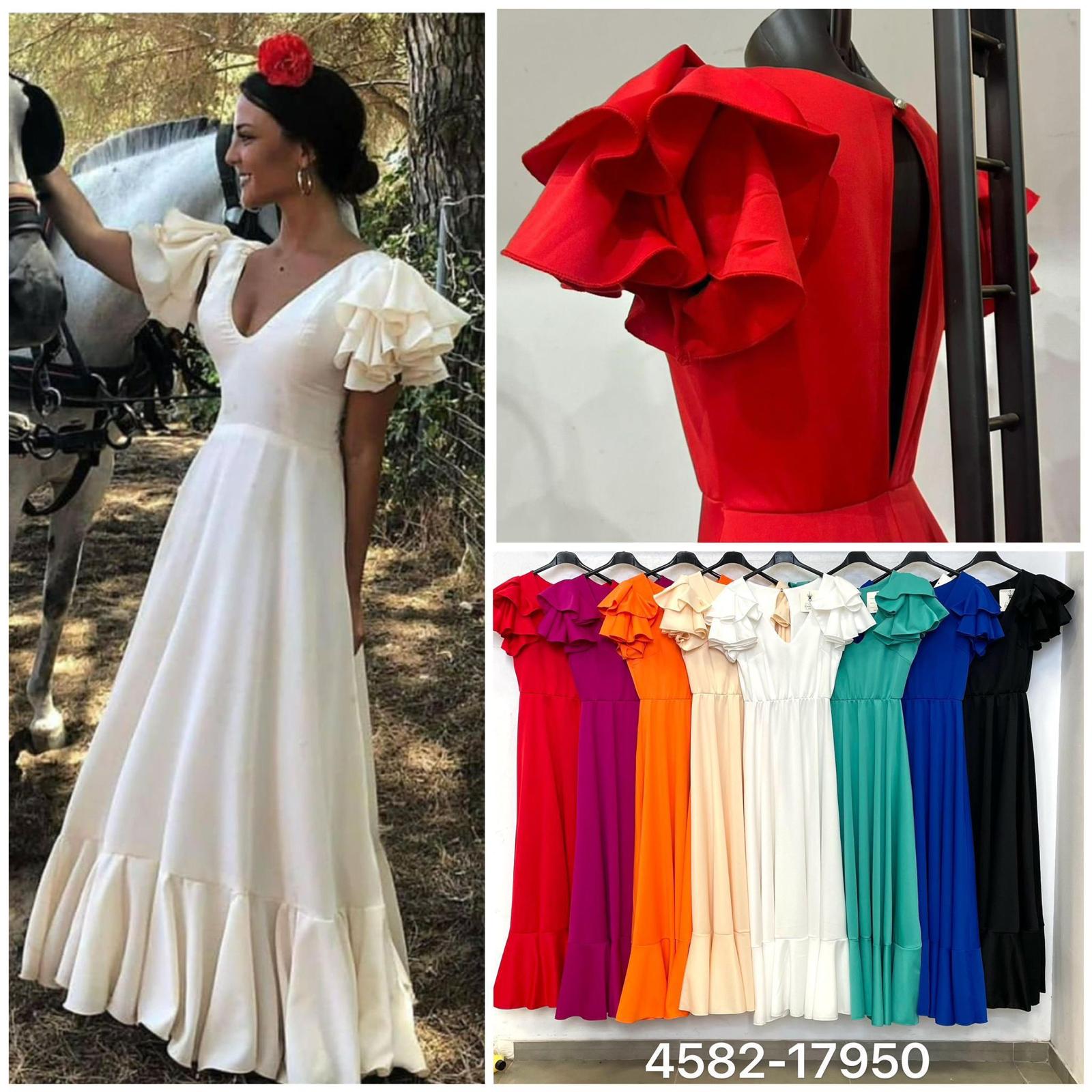 Bata Rociera económica, ideal para cualquier romería o feria. Tejido elástico, se adapta muy bien al cuerpo y es muy cómoda. Tiene una abertura en la espalda en forma de lágrima, dando un toque sofisticado y femenino. Volantes en los hombros y en la falda, aportando movimiento. Composición: 95% Polyester y 5% Elastano.