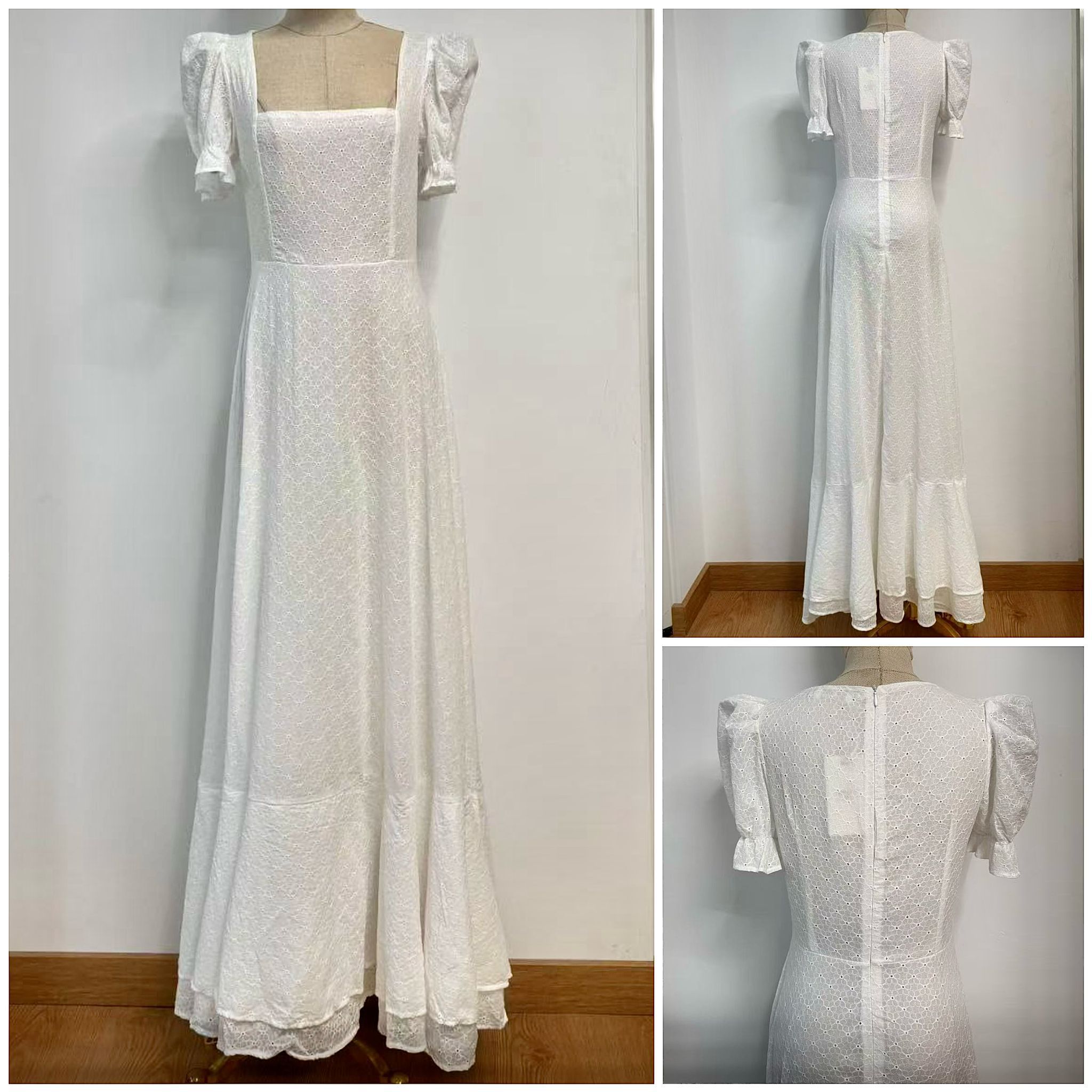 Preciosa bata rociera perforada en color blanco. Escote recto, manga corta abullonada y doble volante en el bajo de la falda. Cierre en la espalda con cremallera. Tejido ligero y suave. Muy cómoda y fresquita, ideal incluso para otras ocasiones.