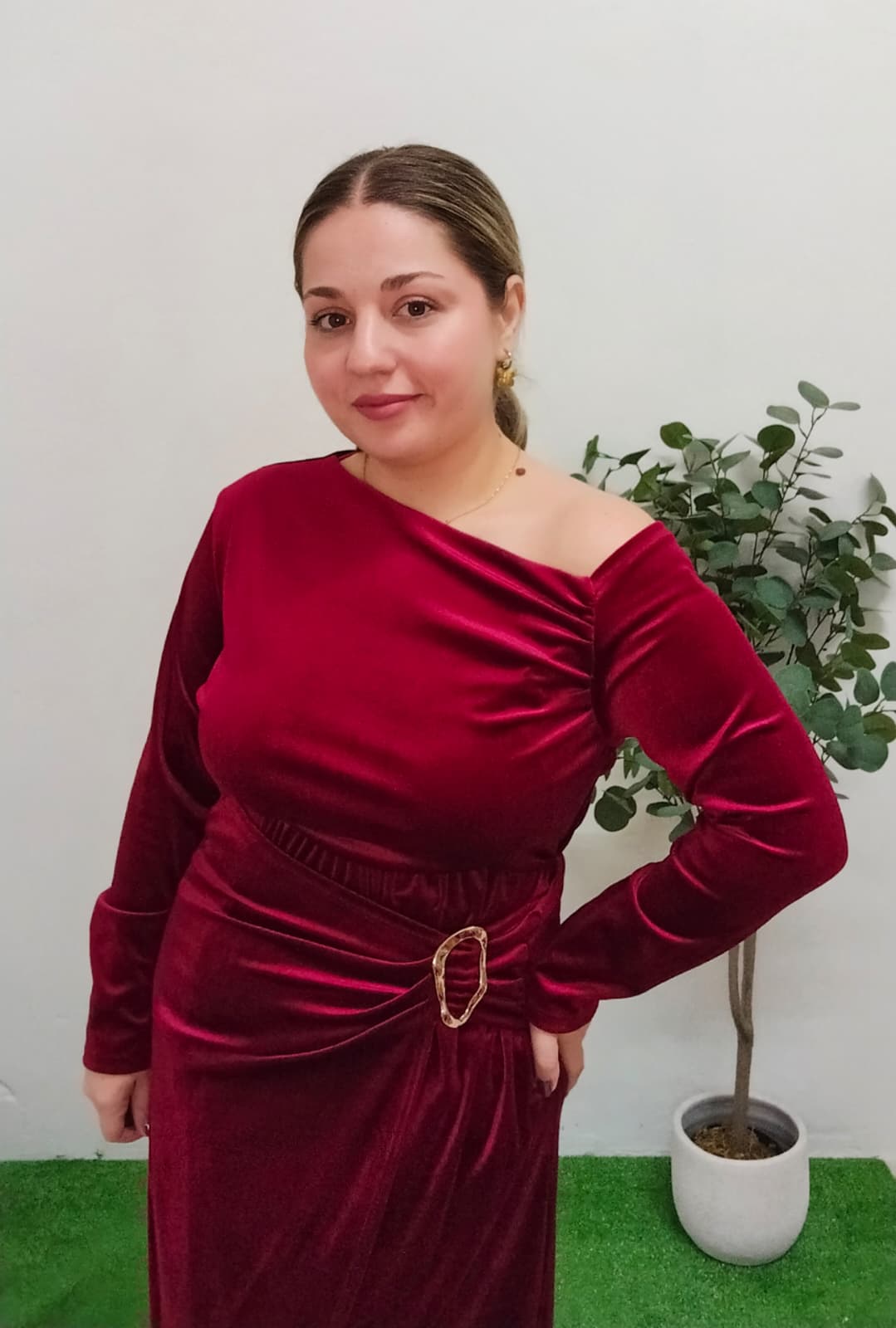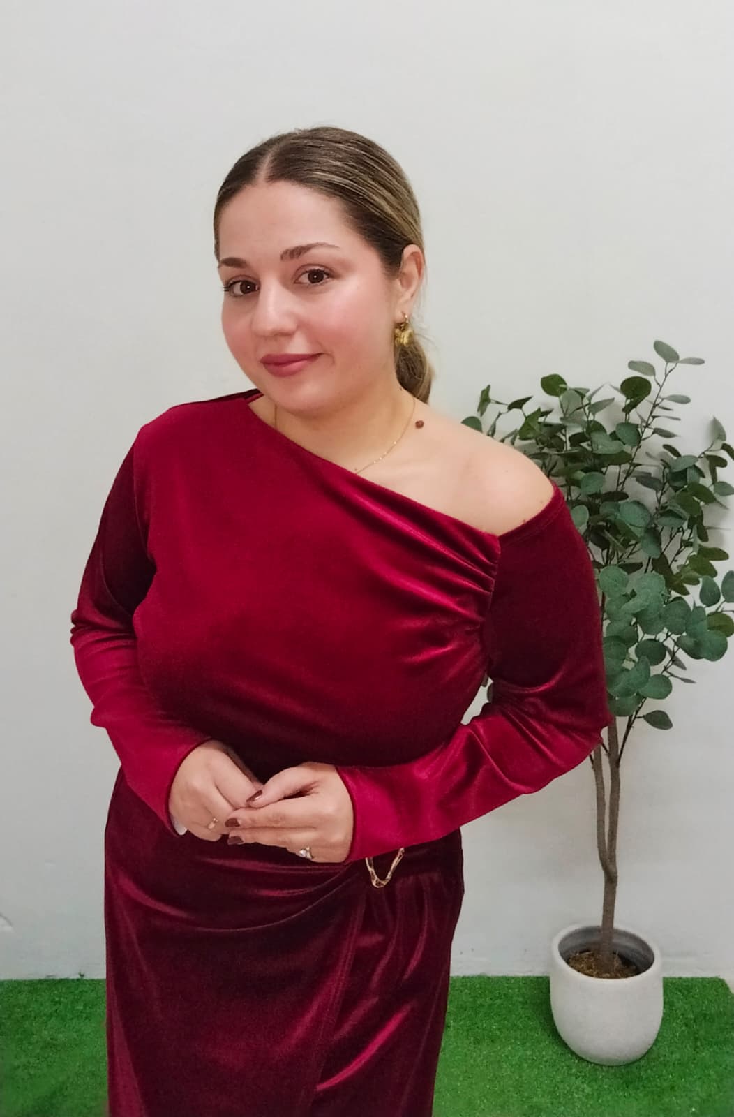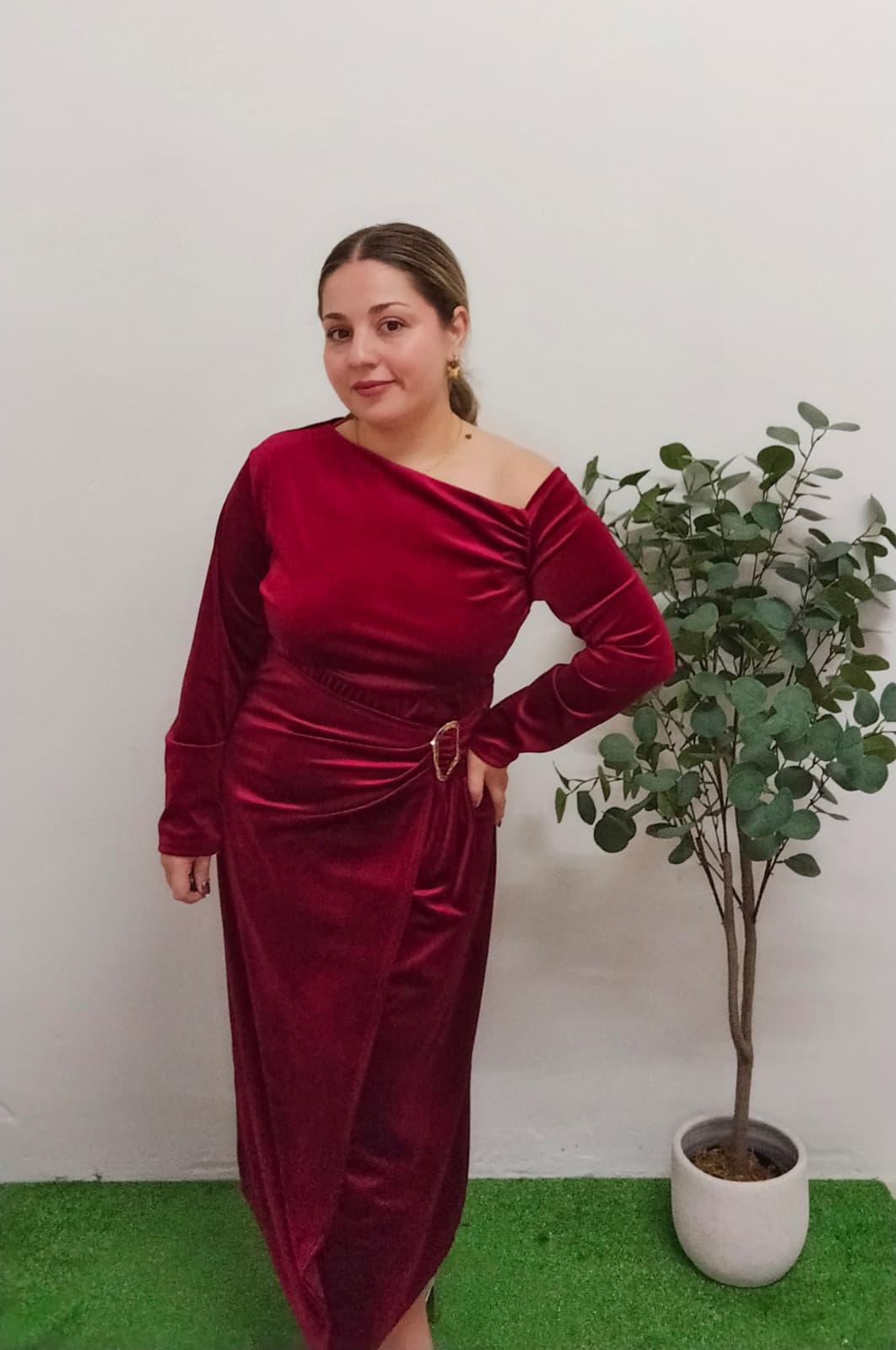 Blusa de manga larga de terciopelo en color rojo – vino tinto. Escote asimétrico, como se puede ver en la foto. Es muy cómoda y súper versátil. Talla única, al ser un tejido elástico, abarcaría desde la talla S hasta la talla XL (36-42). ¡Llévate también la falda a juego y crea tu conjunto ideal!