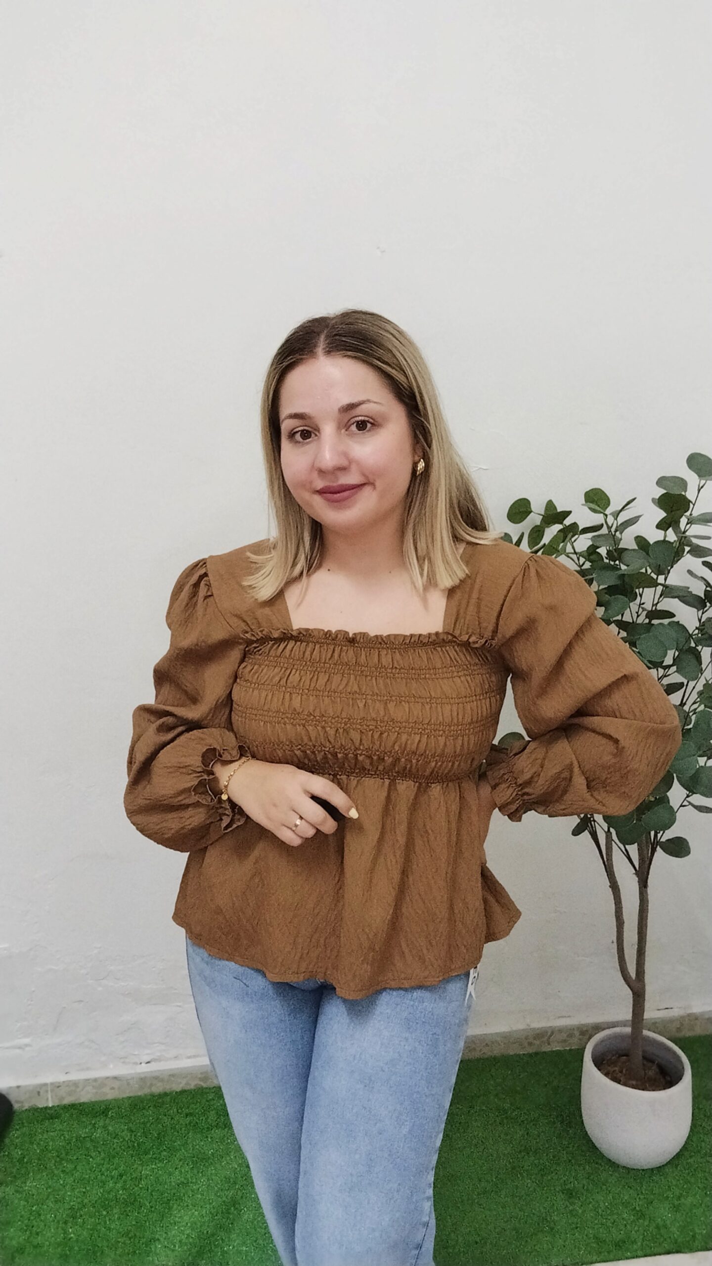 Blusa de manga larga en color marrón. Tejido nido de abeja elástico en la zona del pecho y espalda, por lo que estira y da mucha talla. Manga larga ligeramente abullonada con elástico en los puños. Talla única, abarcaría desde la talla S hasta la talla XL sin problema.