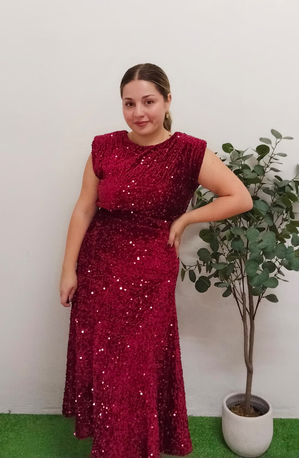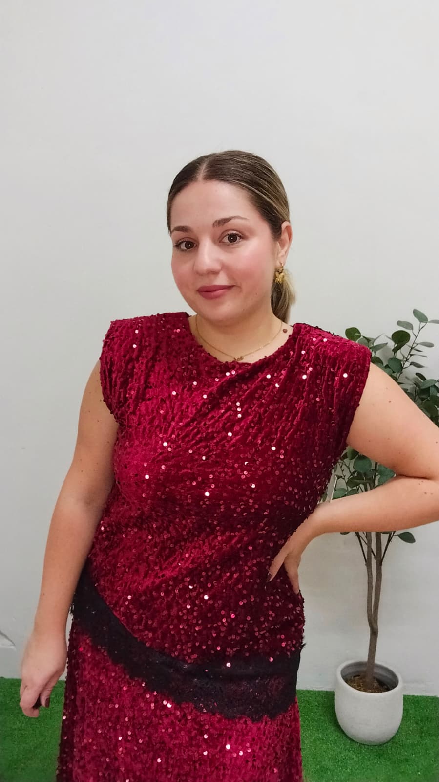 Precioso blusa/top de lentejuelas en color rojo. Lleva hombreras, forro interior y encaje en la cintura. Es muy cómoda y ligera. Es talla única, pero al tratarse de un tejido elástico, da bastante talla. Abarcaría desde la talla S hasta la talla XL (36-42). Llévate también la falda a juego en nuestra web!