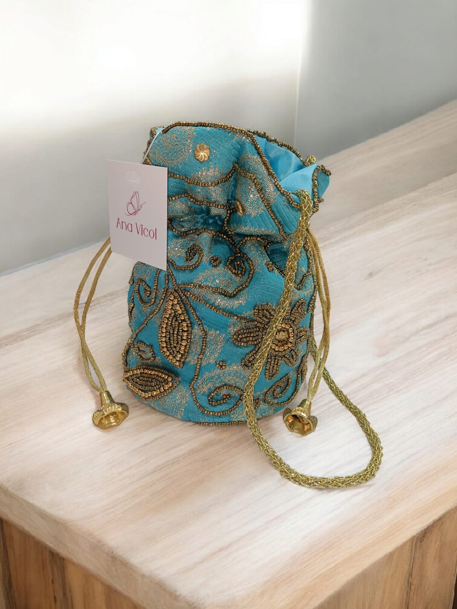 Bolso Bombonera Azul Turquesa Bordado Dorado
