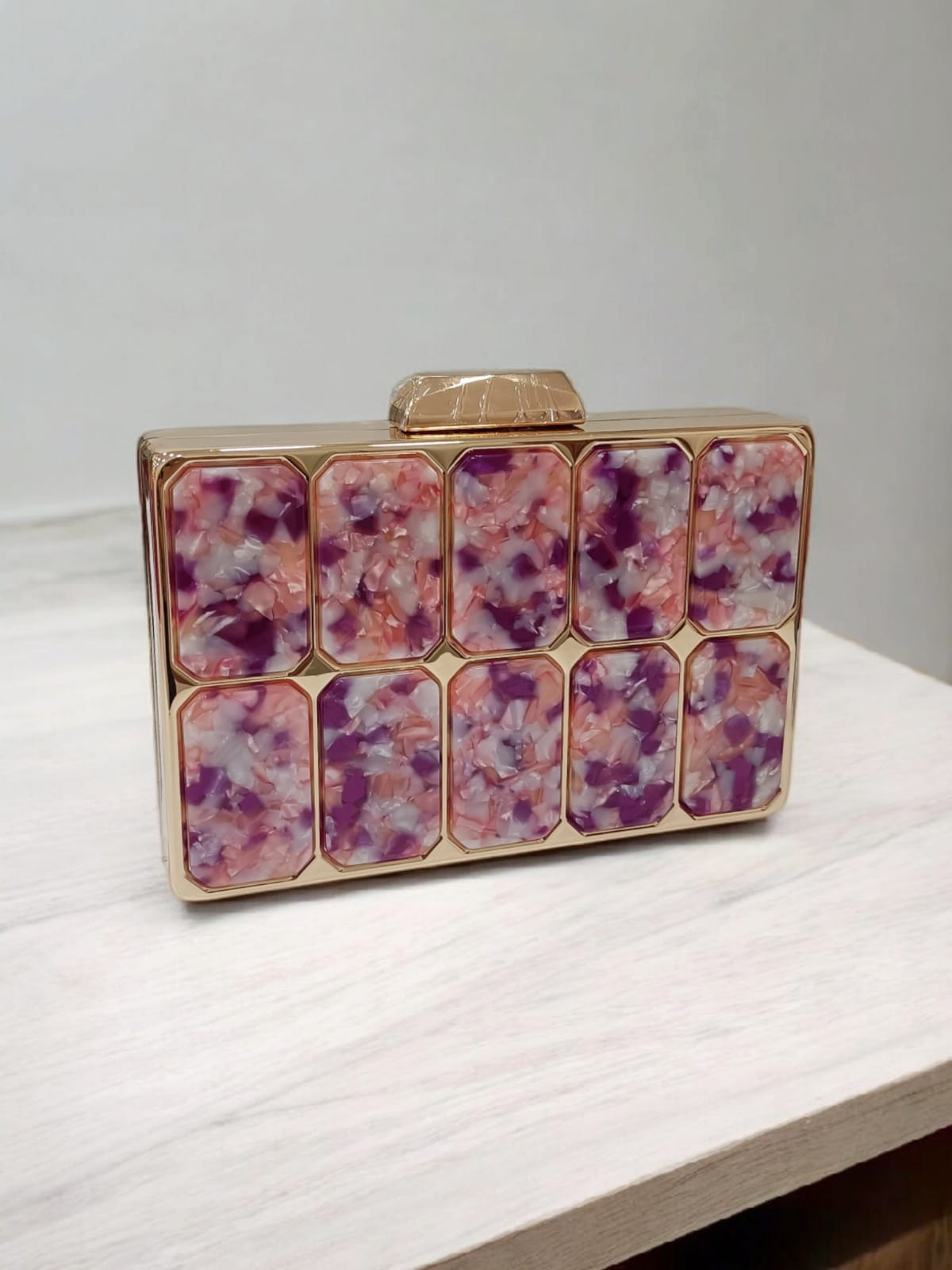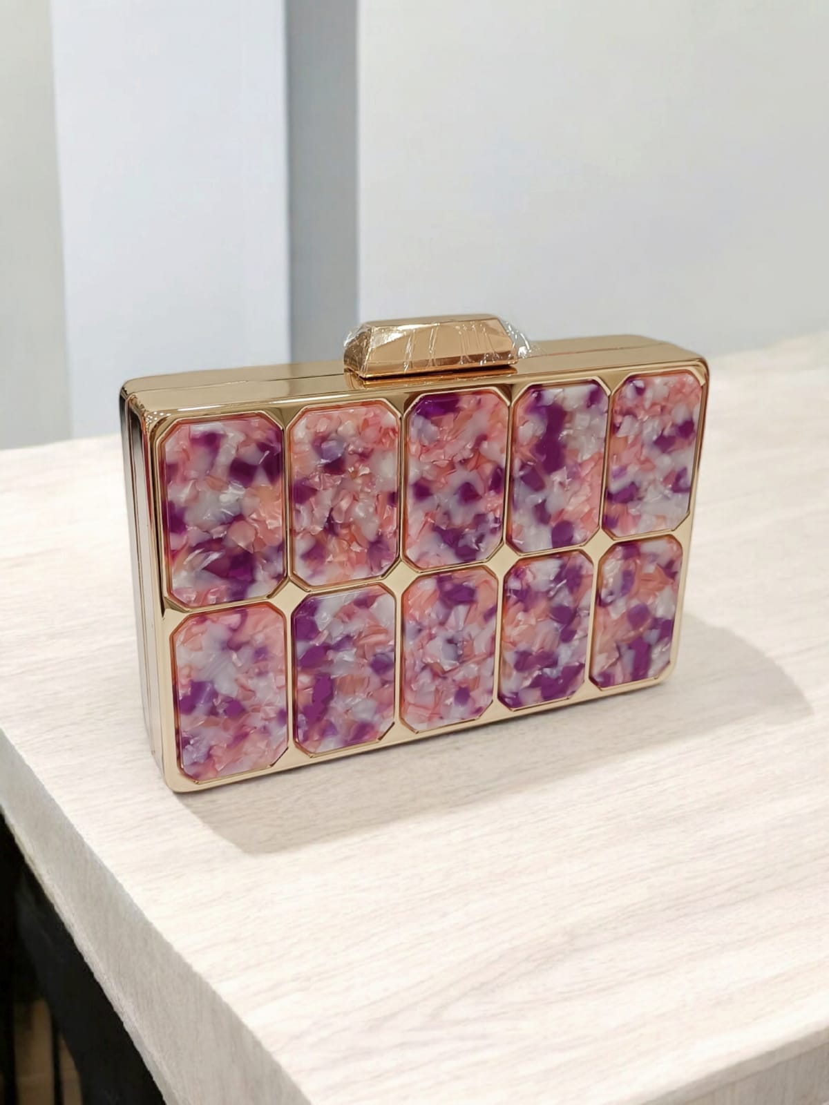 Bolso de fiesta tipo clutch de estructura rígida de nácar con bordes metálicos dorado. Cierre click en la parte superior. Interior forrado en tela. Lleva una cadena metálica extraíble para usar como bandolera. Color dorado y tonos buganvilla..