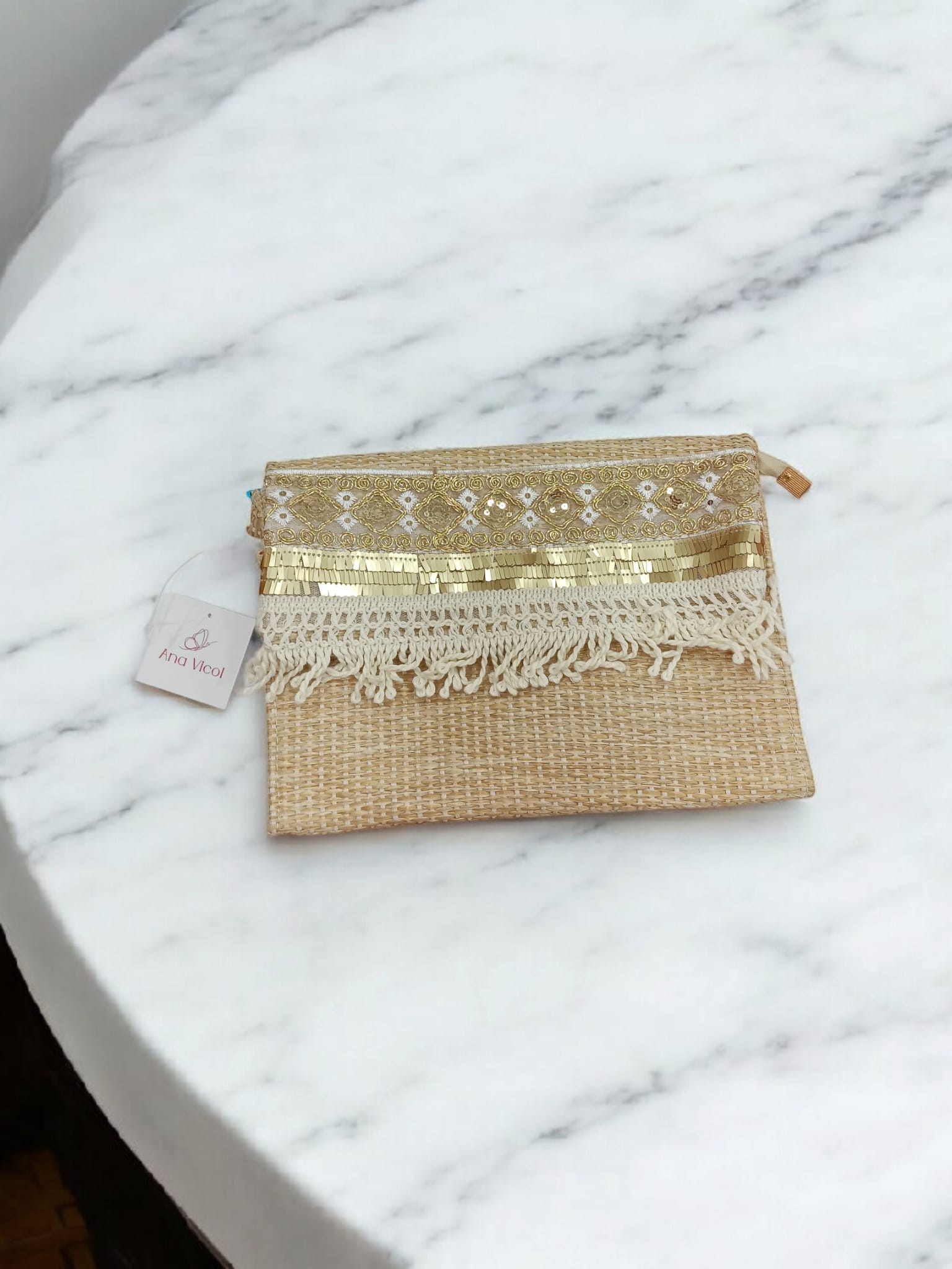 Bolso de mano de rafia estilo clutch en color beige natural. Diseño con lentejuelas y flecos. Tiene un asa corto de mano y otro asa largo ajustable y extraíble. Cierre de imán en la solapa y cierre interior con cremallera. Interior forrado. ¡Ideal y cómodo para tus looks este verano!