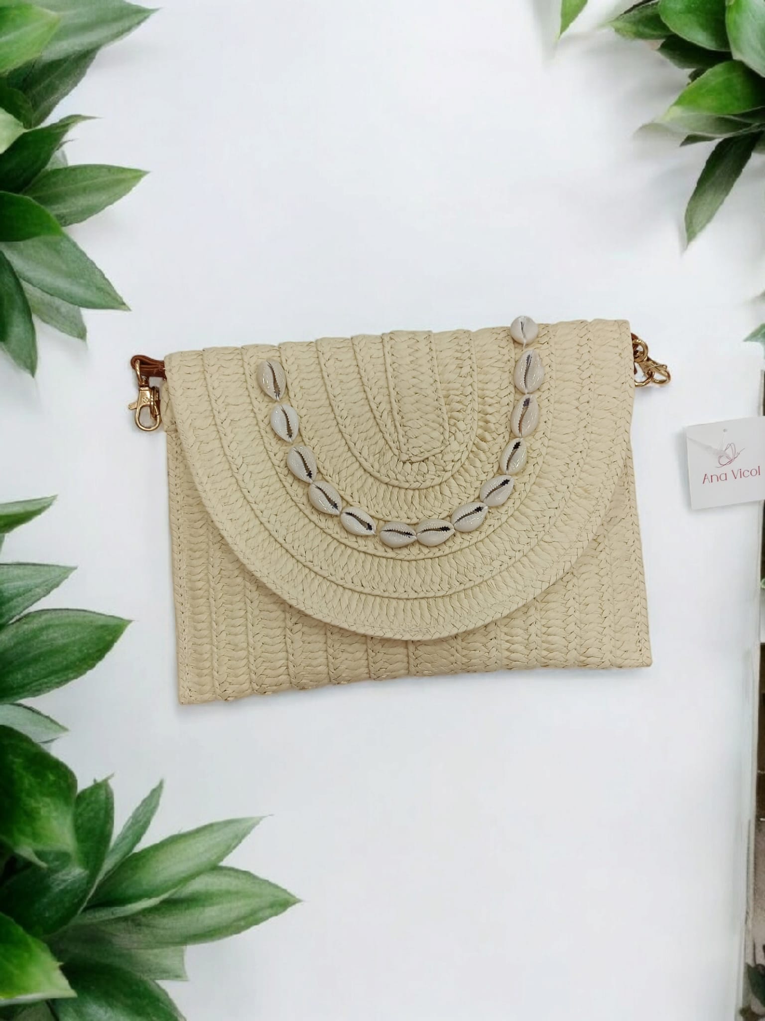 Bolso de mano de rafia estilo clutch en color beige natural. Diseño de conchitas. Tiene un asa corto de mano y otro asa largo ajustable y extraíbles. Cierre de imán en la solapa y cierre interior con cremallera. Interior forrado. ¡Ideal y cómodo para tus looks este verano!