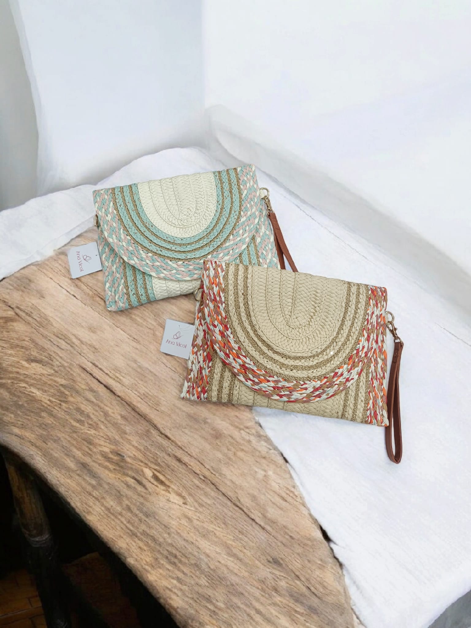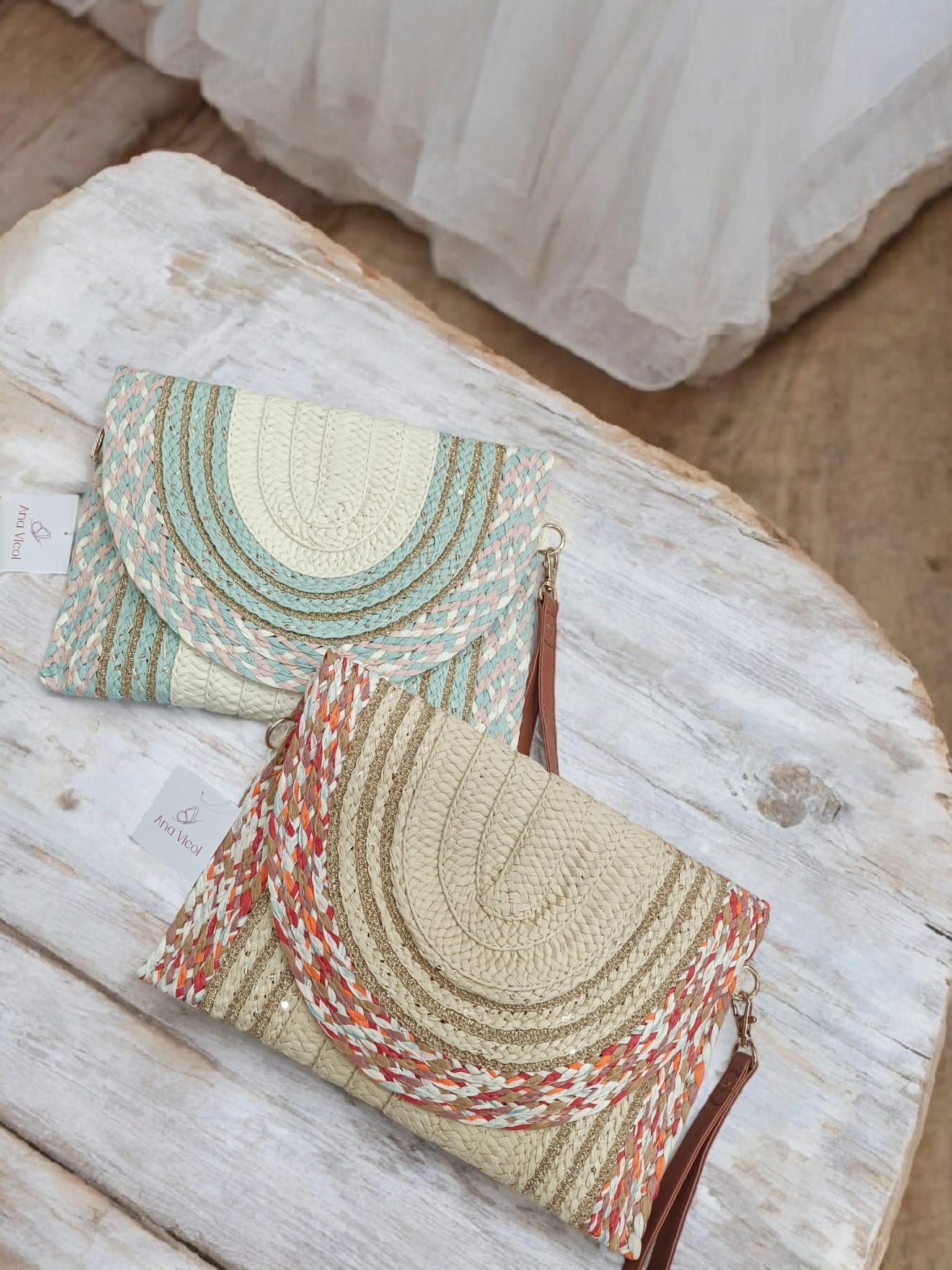 Bolso de mano de rafia estilo clutch. Diseños trenzados de colores. Tienen un asa corto de mano y otro asa largo ajustable y extraíbles. Cierre de imán en la solapa y cierre interior con cremallera. Interior forrado. ¡Ideales y cómodos para tus looks este verano! Disponible en dos colores.