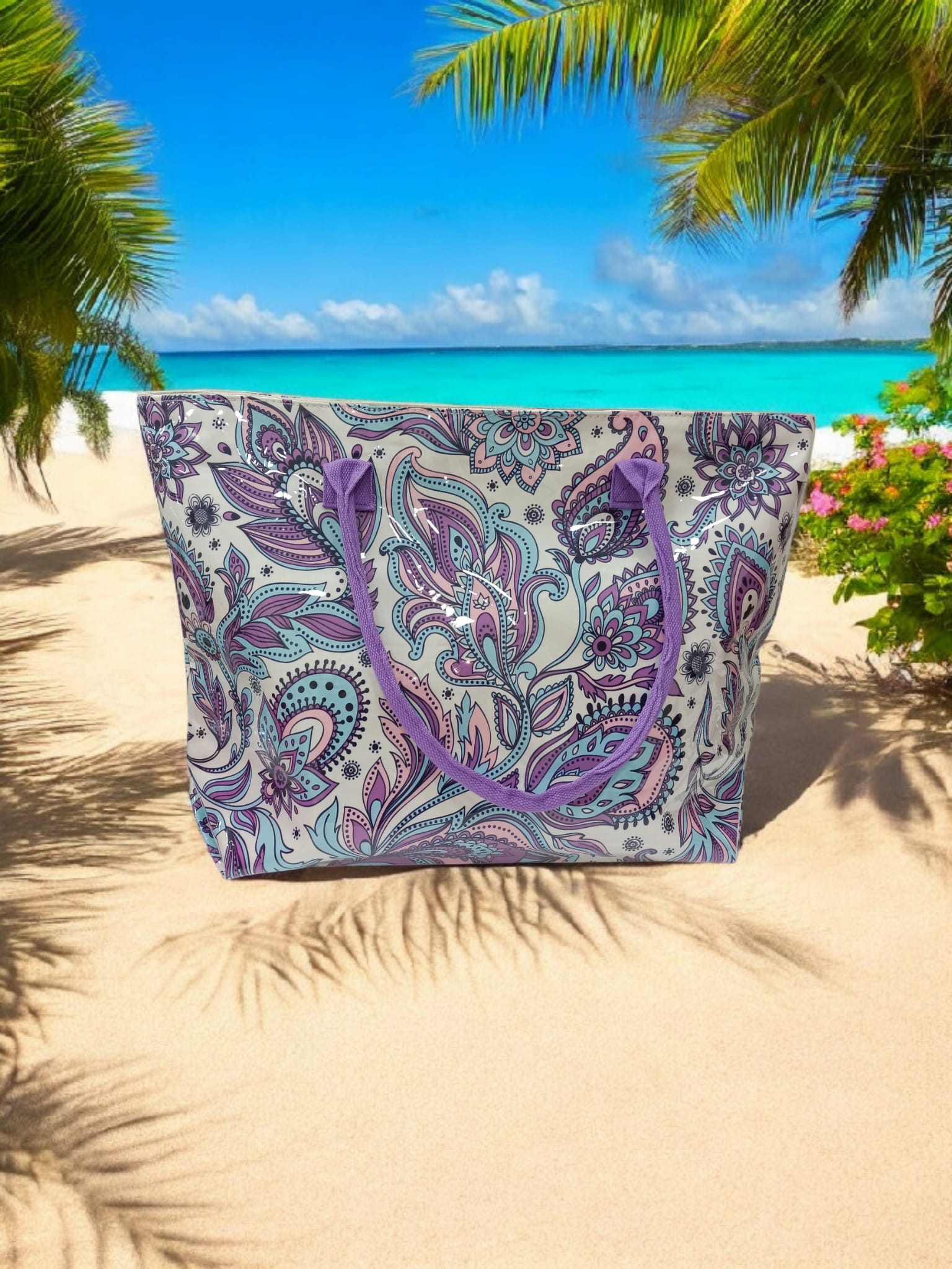 ¡El bolso que necesitas este verano! Bolso ideal para playa o piscina con gran capacidad de almacenamiento. Estampado en tono lila y morado. Lo mejor: ¡es impermeable!