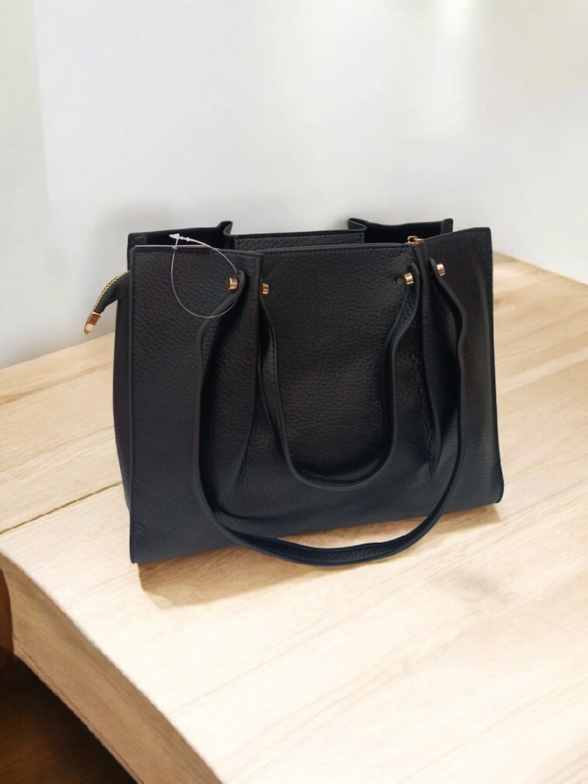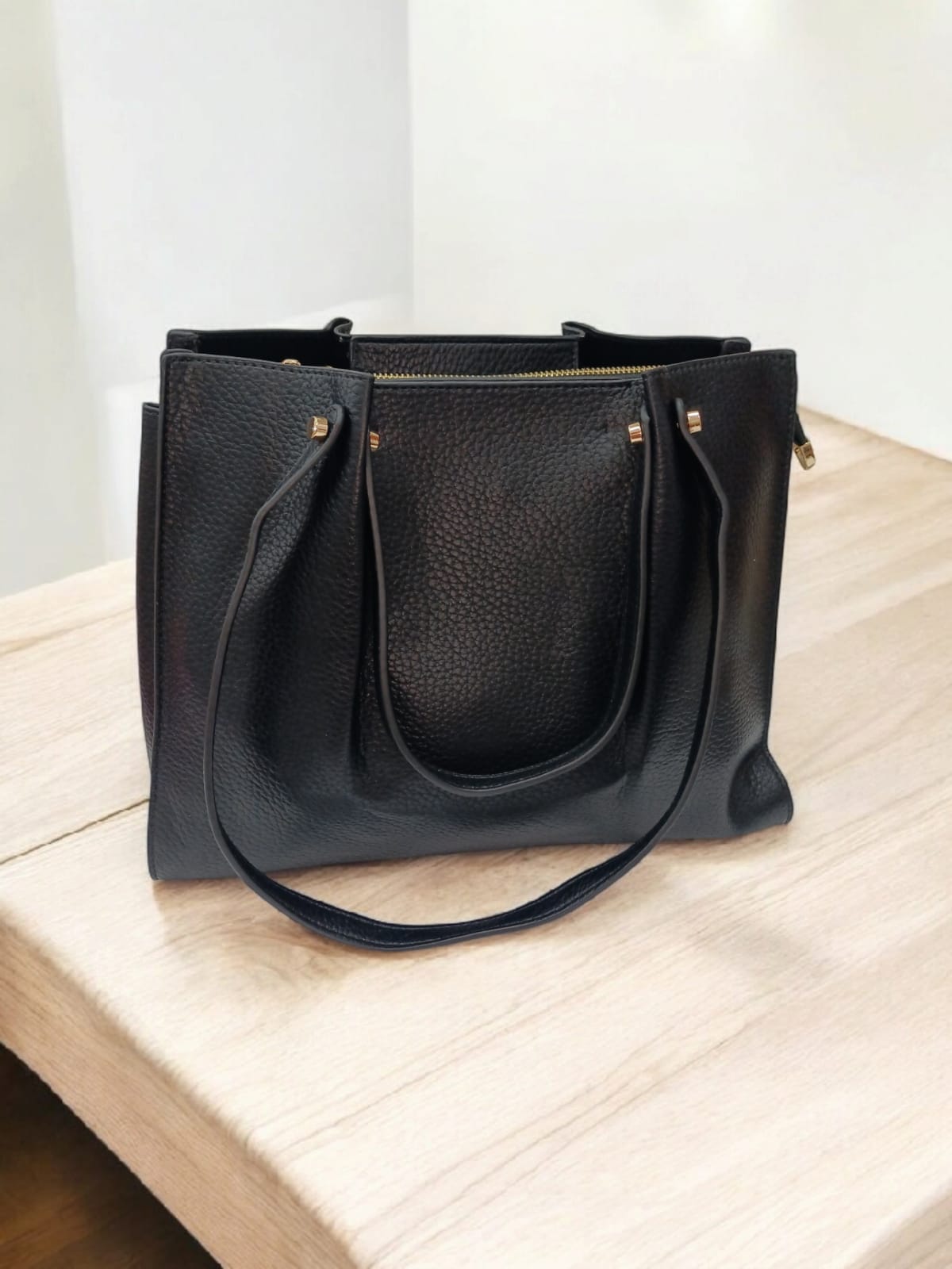 Bolso shopper de hombro en color negro. Tiene dos asas más cortos y otro asa largo ajustable y extraíble. Tres compartimentos en el interior, el principal más amplio con cierre de cremallera. Los otros dos compartimentos lateral con cierre de imán. Interior forrado. Bolso muy cómodo y ligero, ideal para cualquier ocasión.