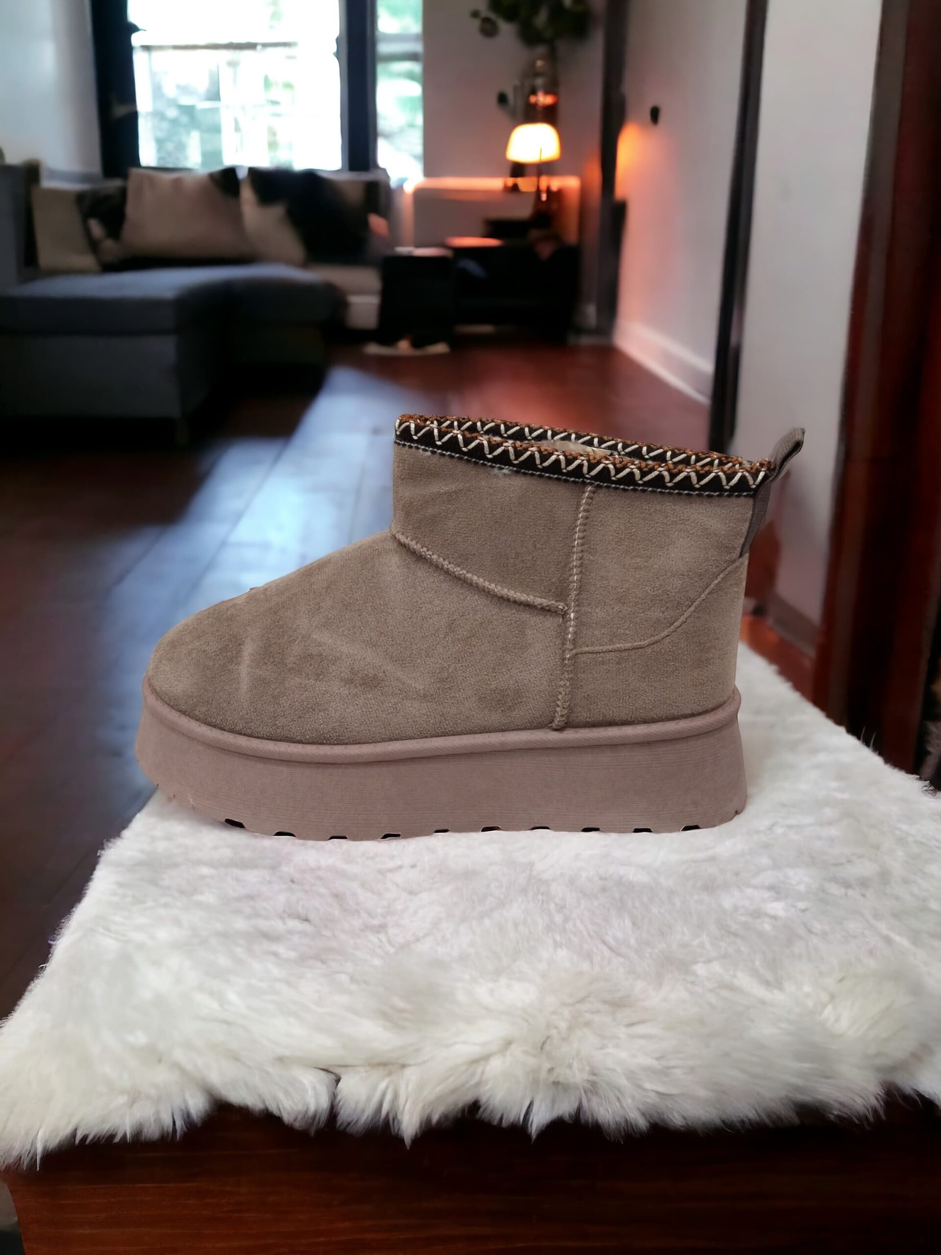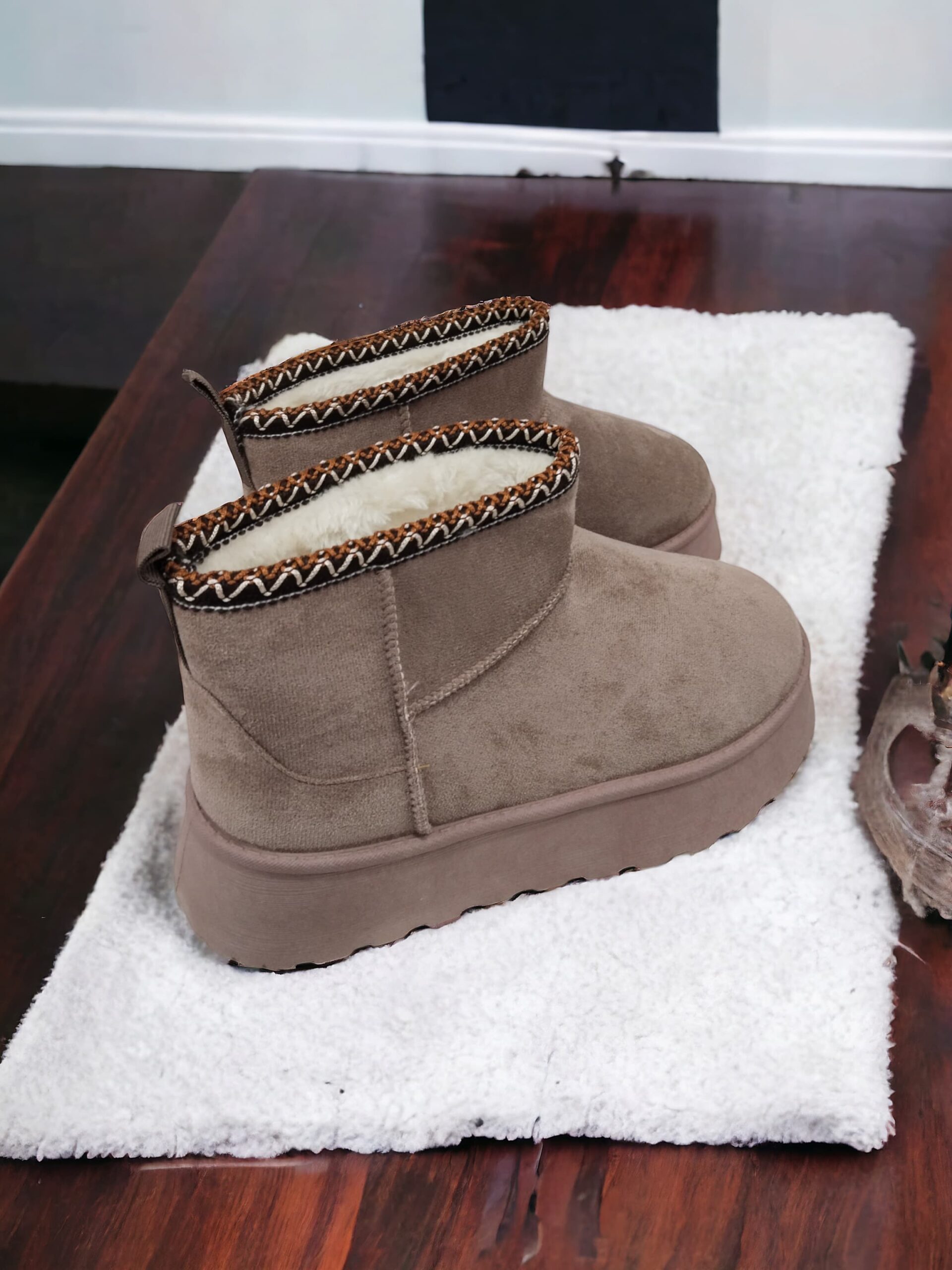Botas/botines Ugg, también conocidas como «australianas» de caña baja. Plataforma de 4cm, bordado étnico en el borde, pelito en el interior y plantilla de tejido de pelo ecológico. Suela de goma.