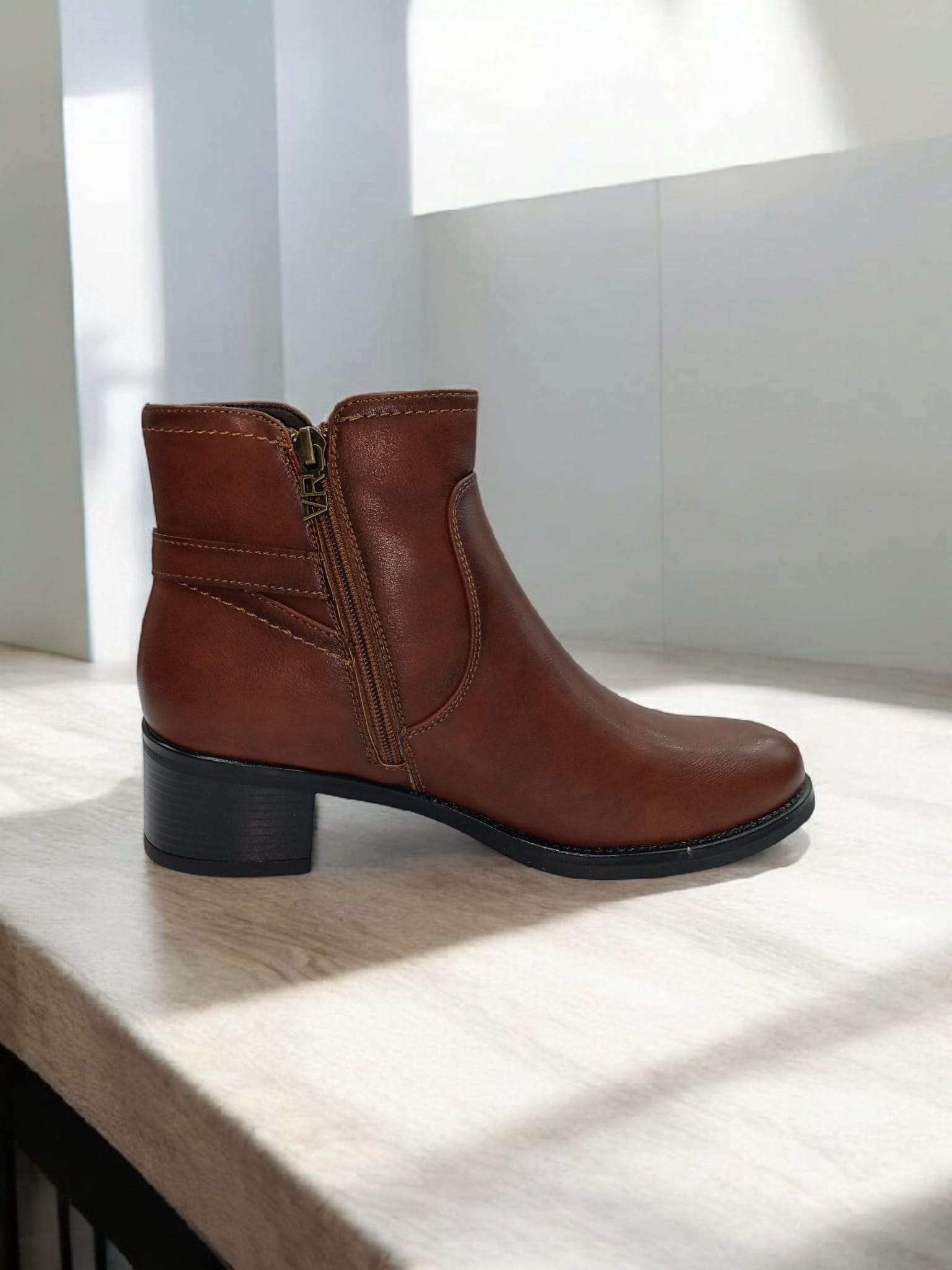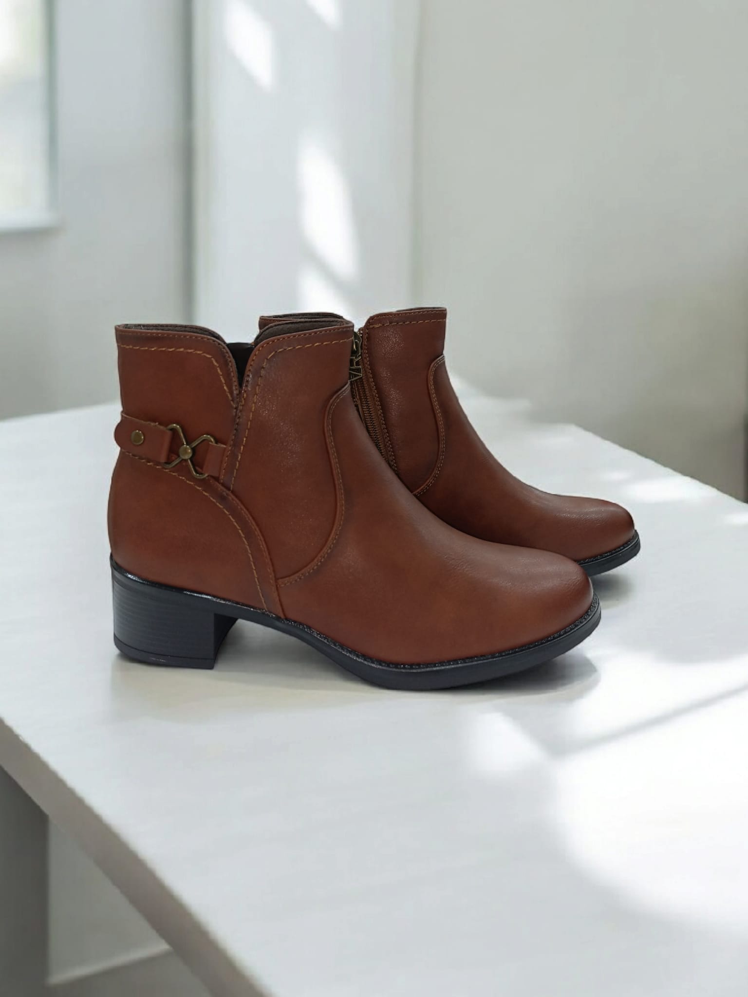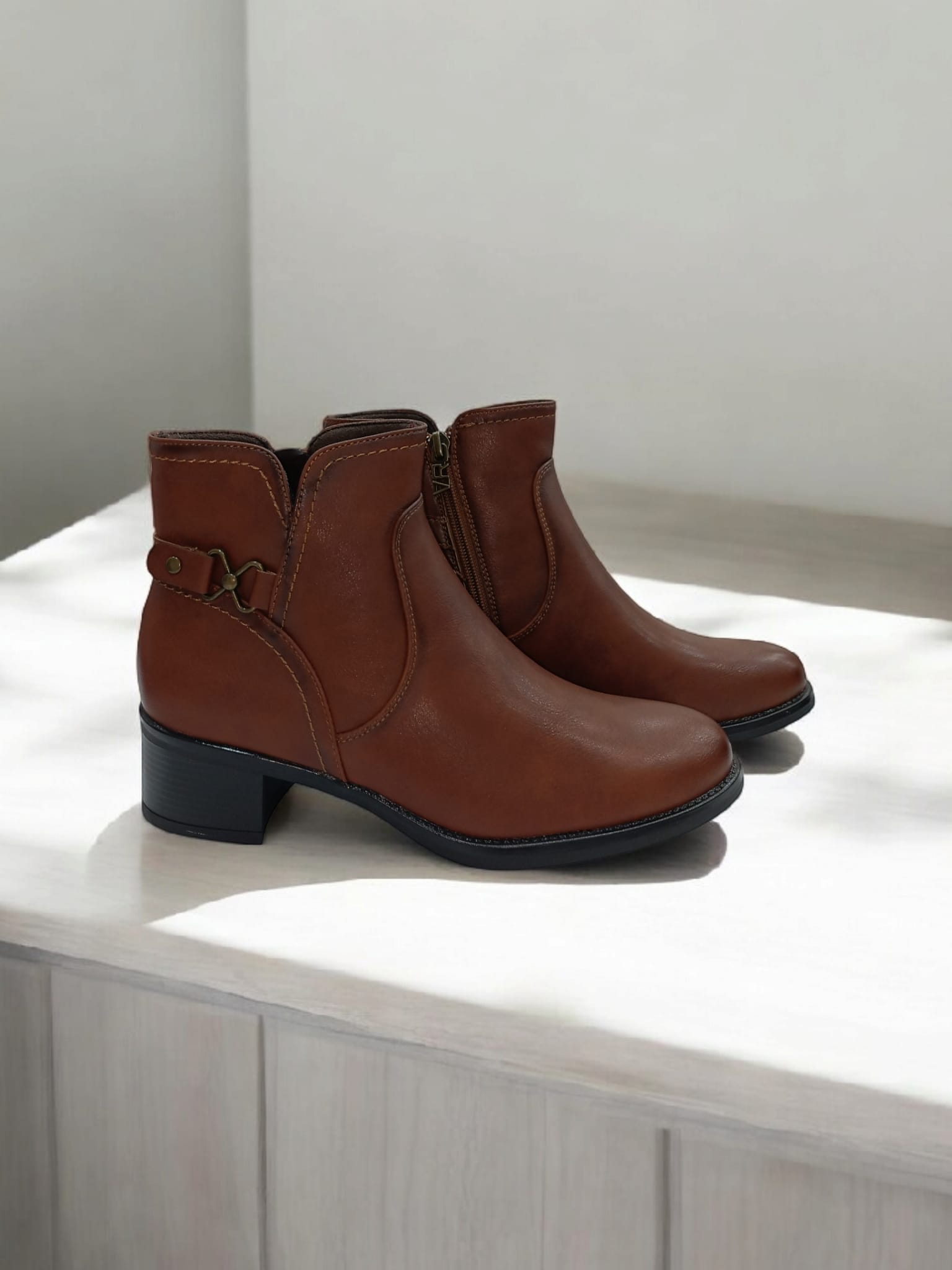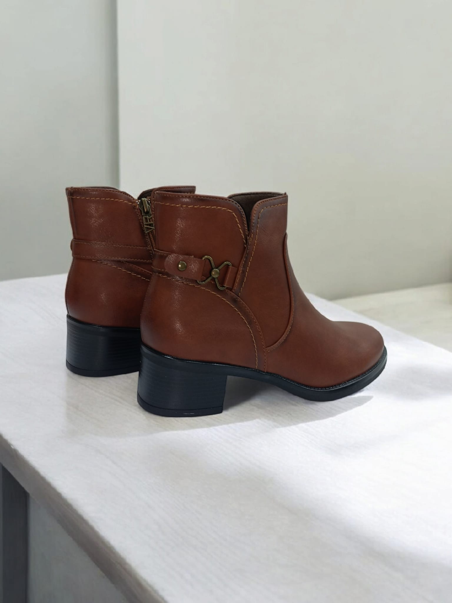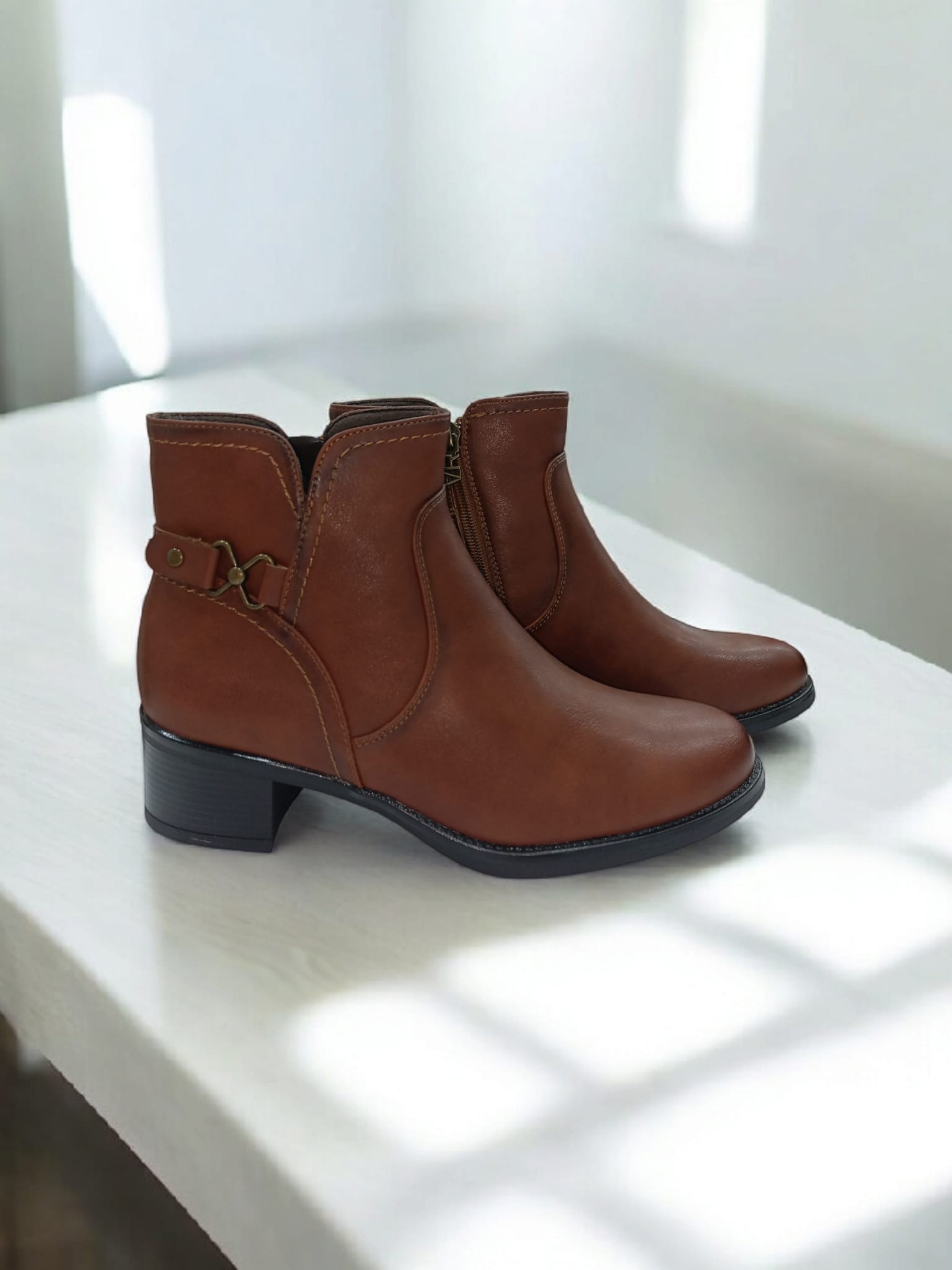 ¡Los botines más cómodos que necesitas esta temporada! Este botín en color marrón es ideal para tu día a día por su comodidad y versatilidad. Con un comodísimo tacón de apenas 4cm, cuenta con suela antideslizante para los días de lluvia, cierre de cremallera en la zona interna del botín y una tira con un detalle dorado envejecido en la zona de la caña. Perfectos para tus looks de diario.
