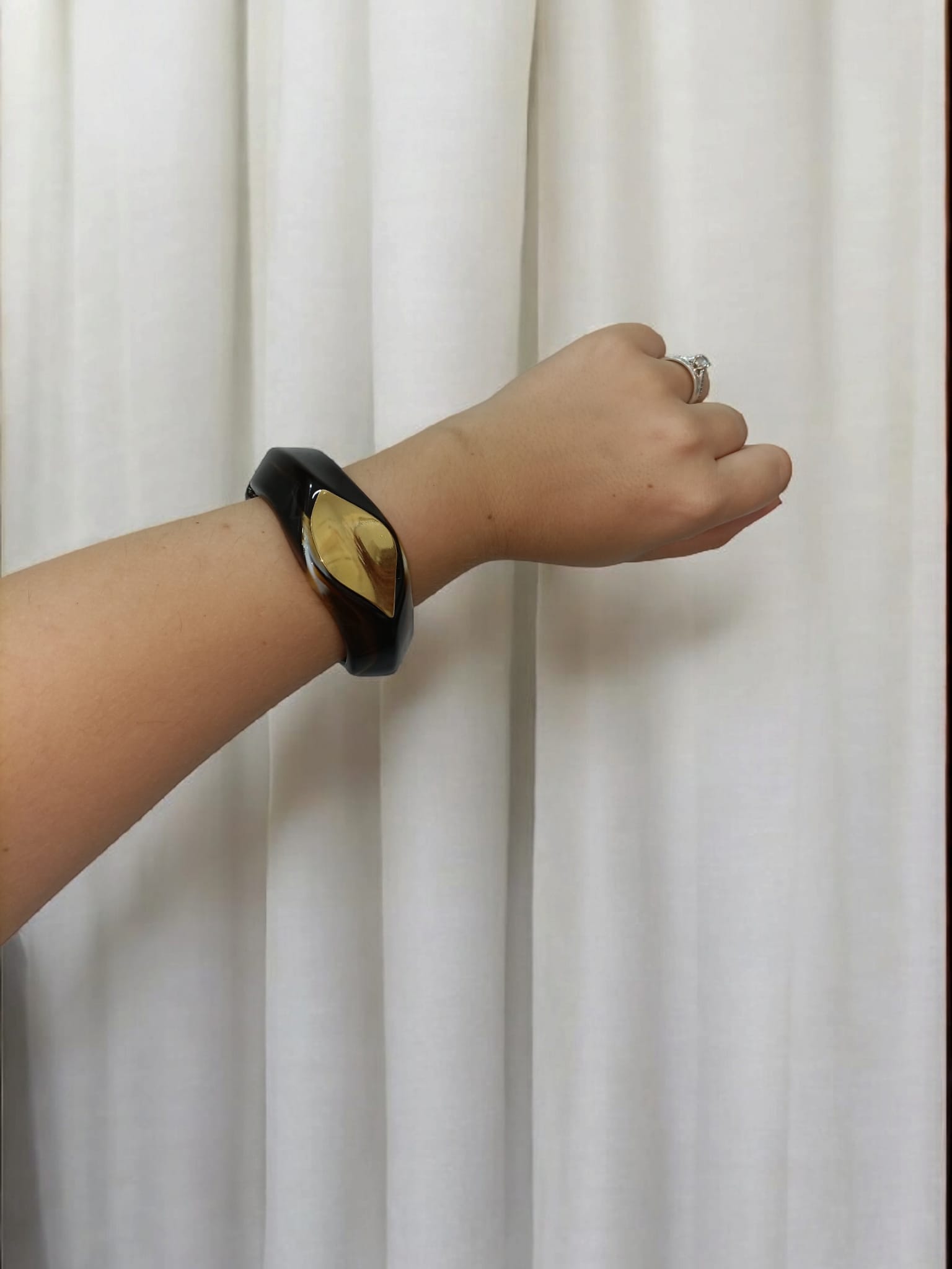 Precioso brazalete acrílico de unos 3cm de ancho en color marrón chocolate con detalle dorado. El brazalete se abre para colocar y queda perfectamente cerrado. Ideal para completar tu outfit en cualquier evento.