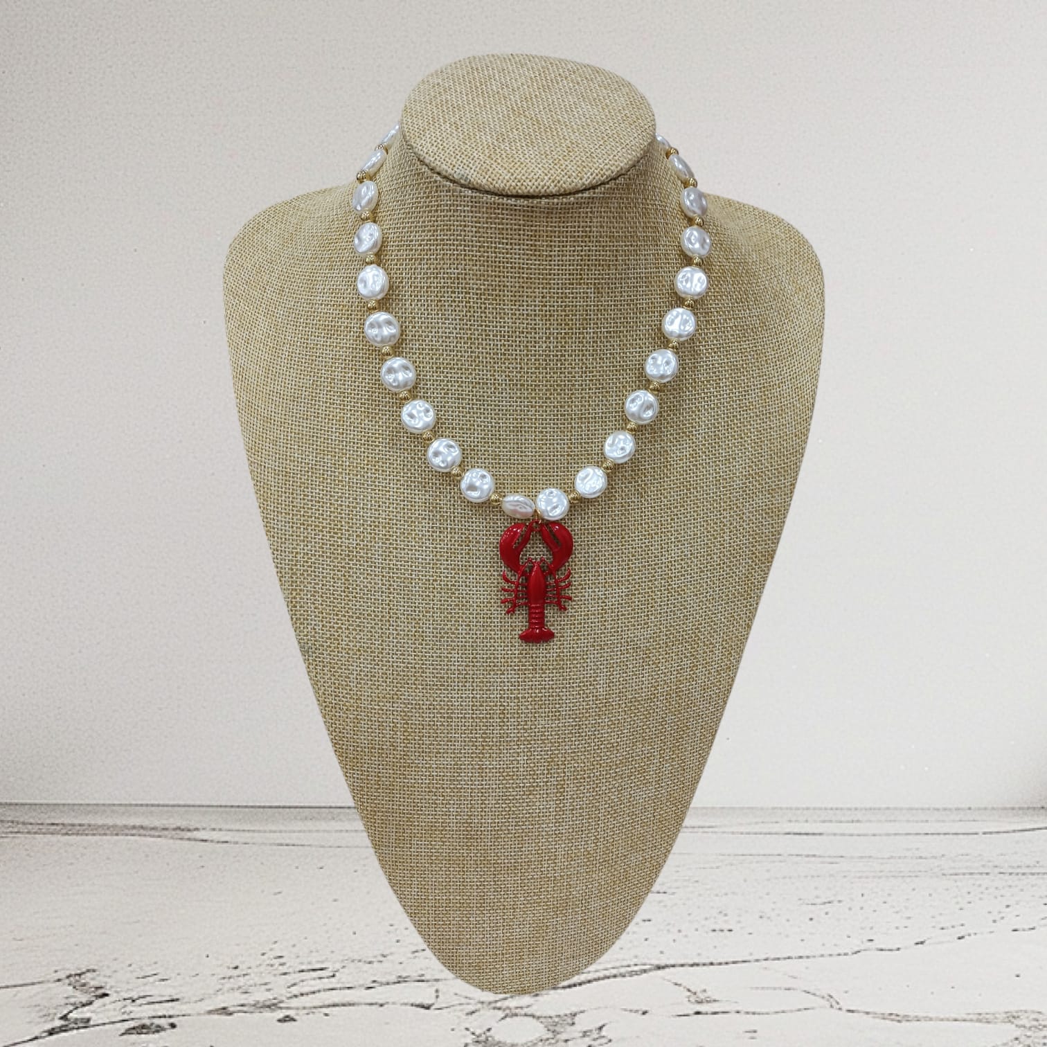 Collar diseño abalorios blanco perla y colgante diseño cangrejo rojo.
