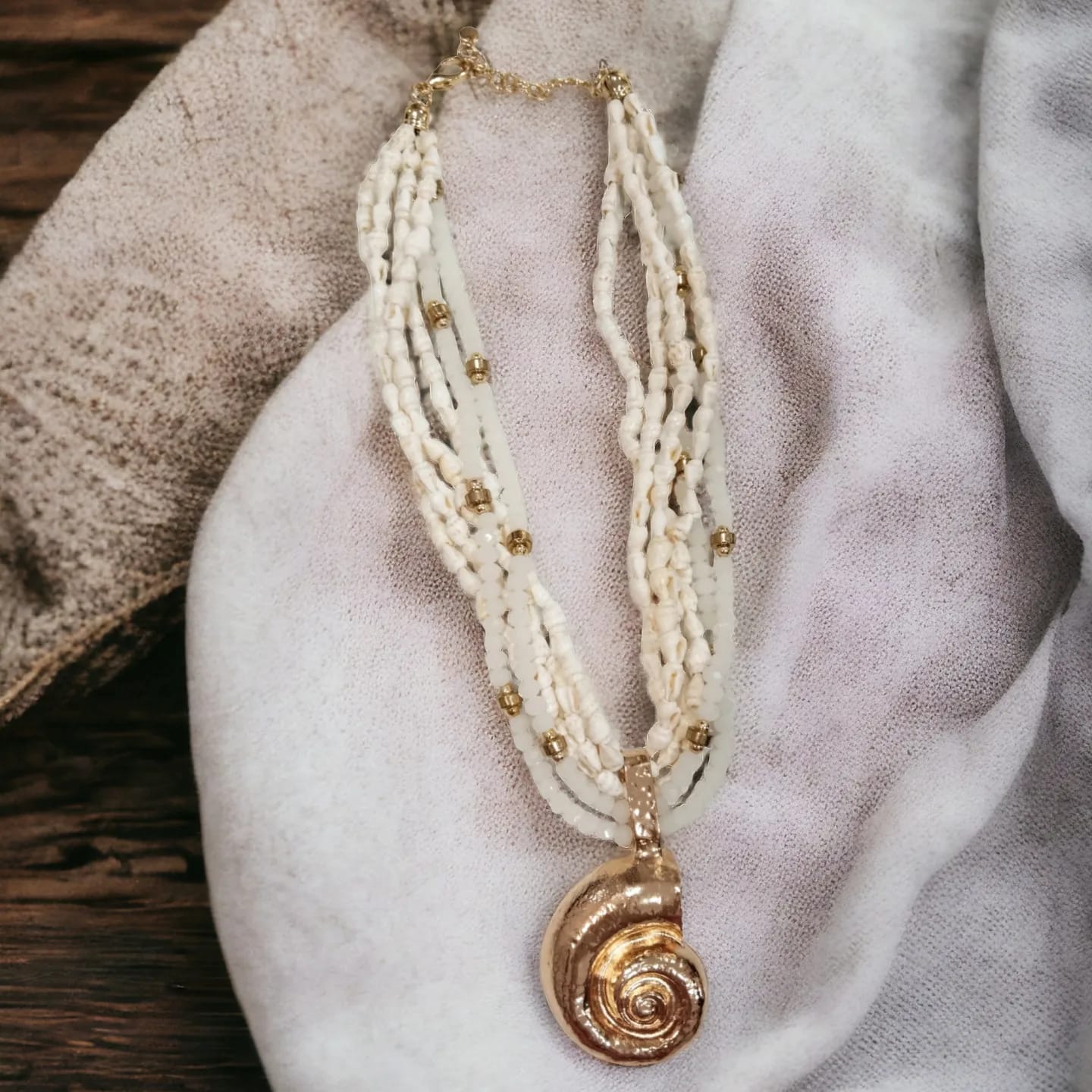 Precioso collar con colgante de caracola en color oro y abalorios de nácar en color beige.