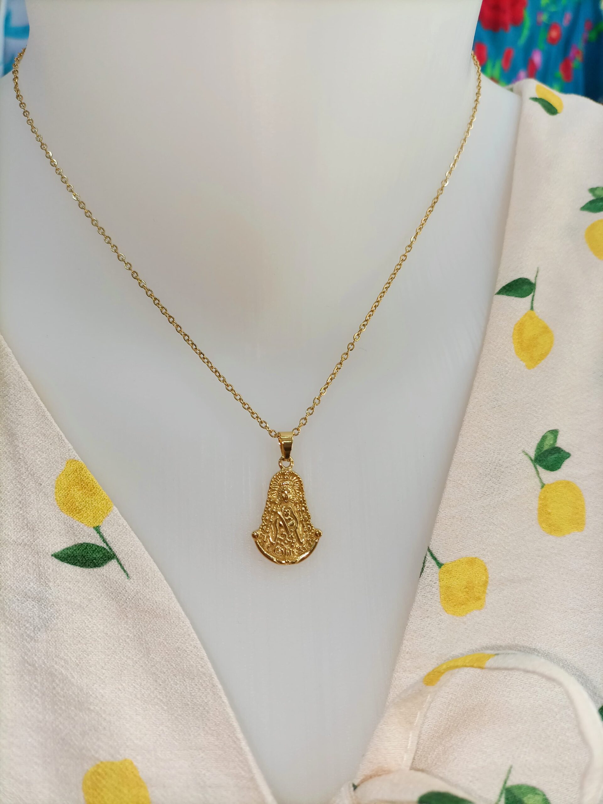 Cadena de acero inoxidable y colgante de la Virgen del Rocío de acero inoxidable, color dorado.