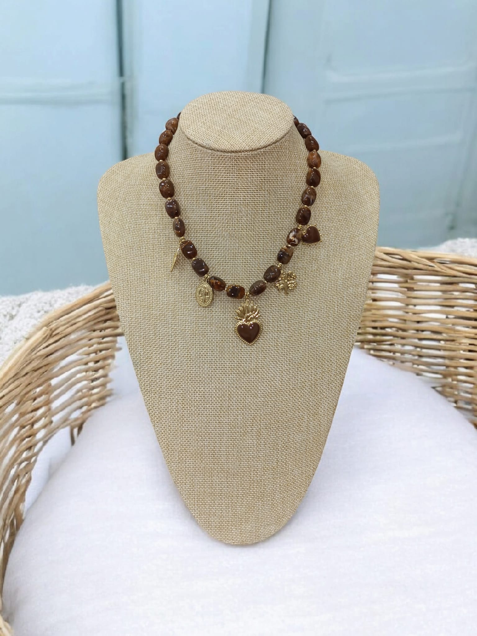 Precioso collar formado por piedras y colgantes en color marrón chocolate. Cadena y cierre de acero inoxidable. Ideal para tus outfits esta temporada!