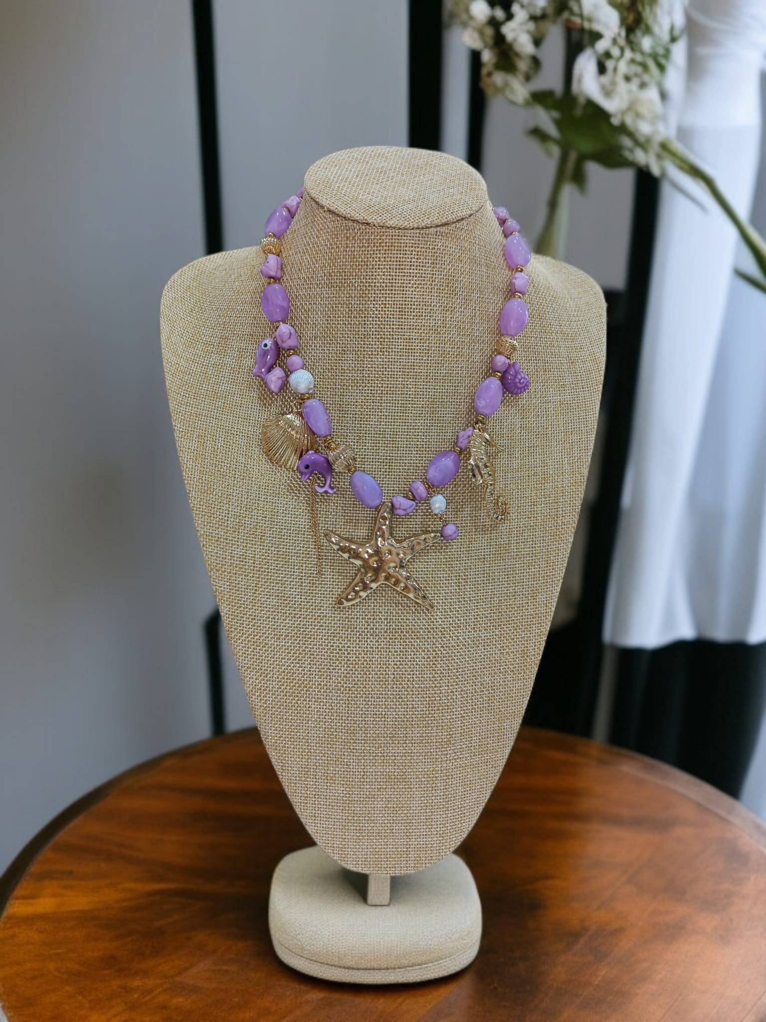 Precioso collar con abalorios en tonos lila – malva con colgantes motivo marino (estrella, caballito de mar…) en color dorado.