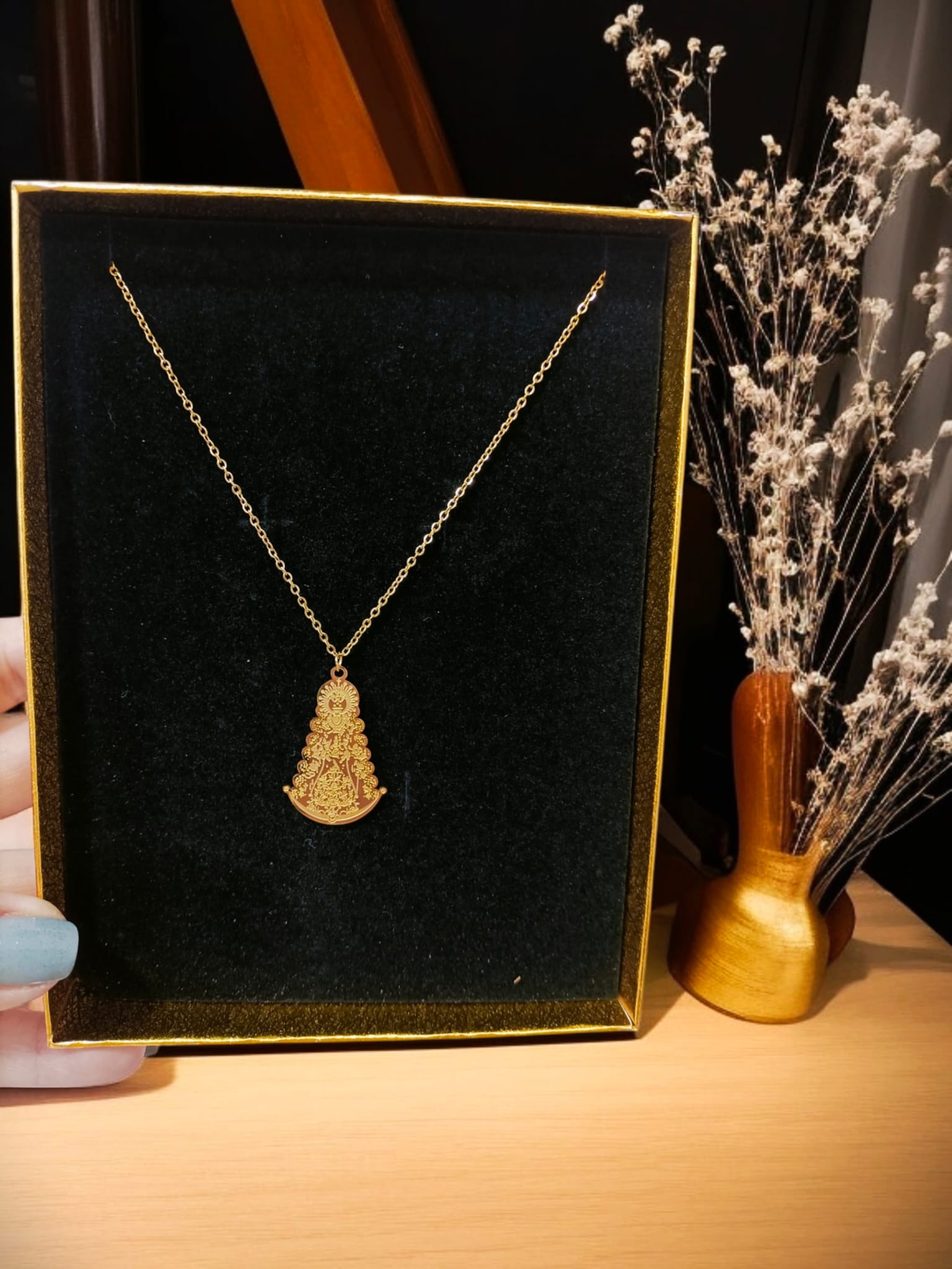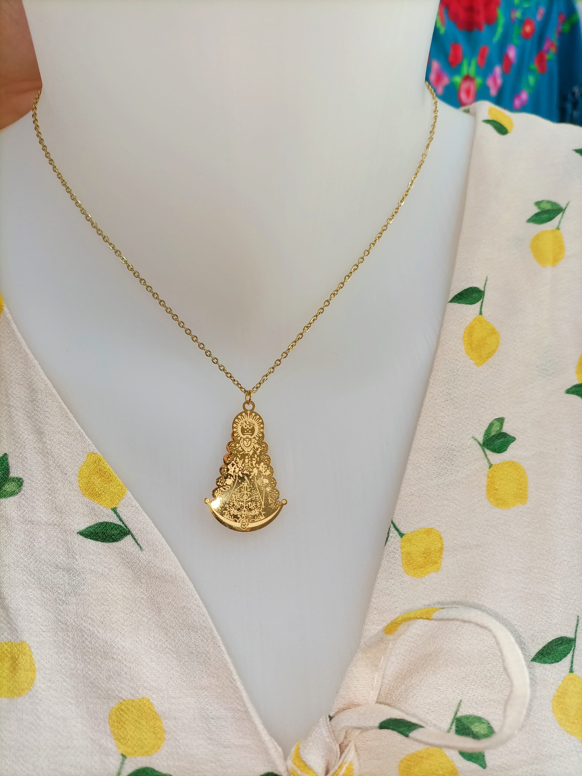 Cadena de acero inoxidable con colgante de la Virgen del Rocío en color dorado.