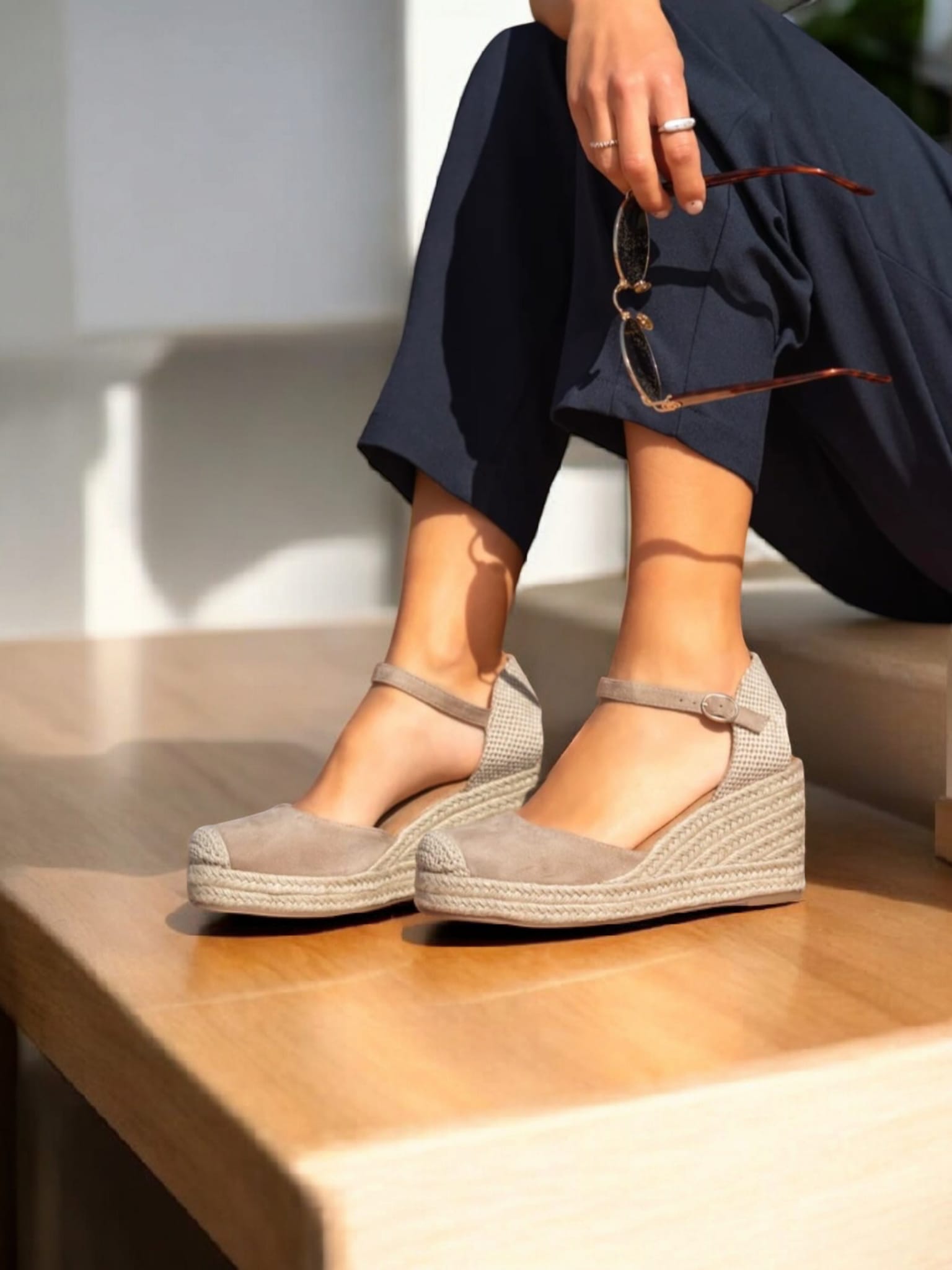 Cuñas de esparto confeccionadas en tejido efecto antelina, 100% transpirable. Son muy cómodas ya que cuentan con una plantilla de gel almohadillada incorporada. Correa ajustable al tobillo y suela vulcanizada en caucho. Son muy ligeras y cómodas, incluso para muchas horas de pie. Puntera de esparto. Ideales para ferias, romerías o eventos. Color beige. Disponibles también en color negro y marrón chocolate en la web.