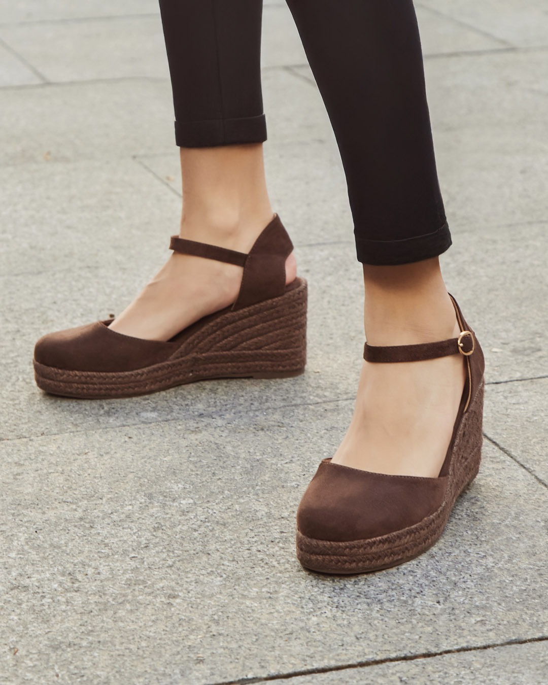 Cuñas de esparto confeccionadas en tejido efecto antelina, 100% transpirable. Son muy cómodas ya que cuentan con una plantilla de gel almohadillada incorporada. Correa ajustable al tobillo y suela vulcanizada en caucho. Son muy ligeras y cómodas, incluso para muchas horas de pie. Puntera de esparto. Ideales para ferias, romerías o eventos. Color marrón chocolate. Disponibles también en color negro y beige en la web.