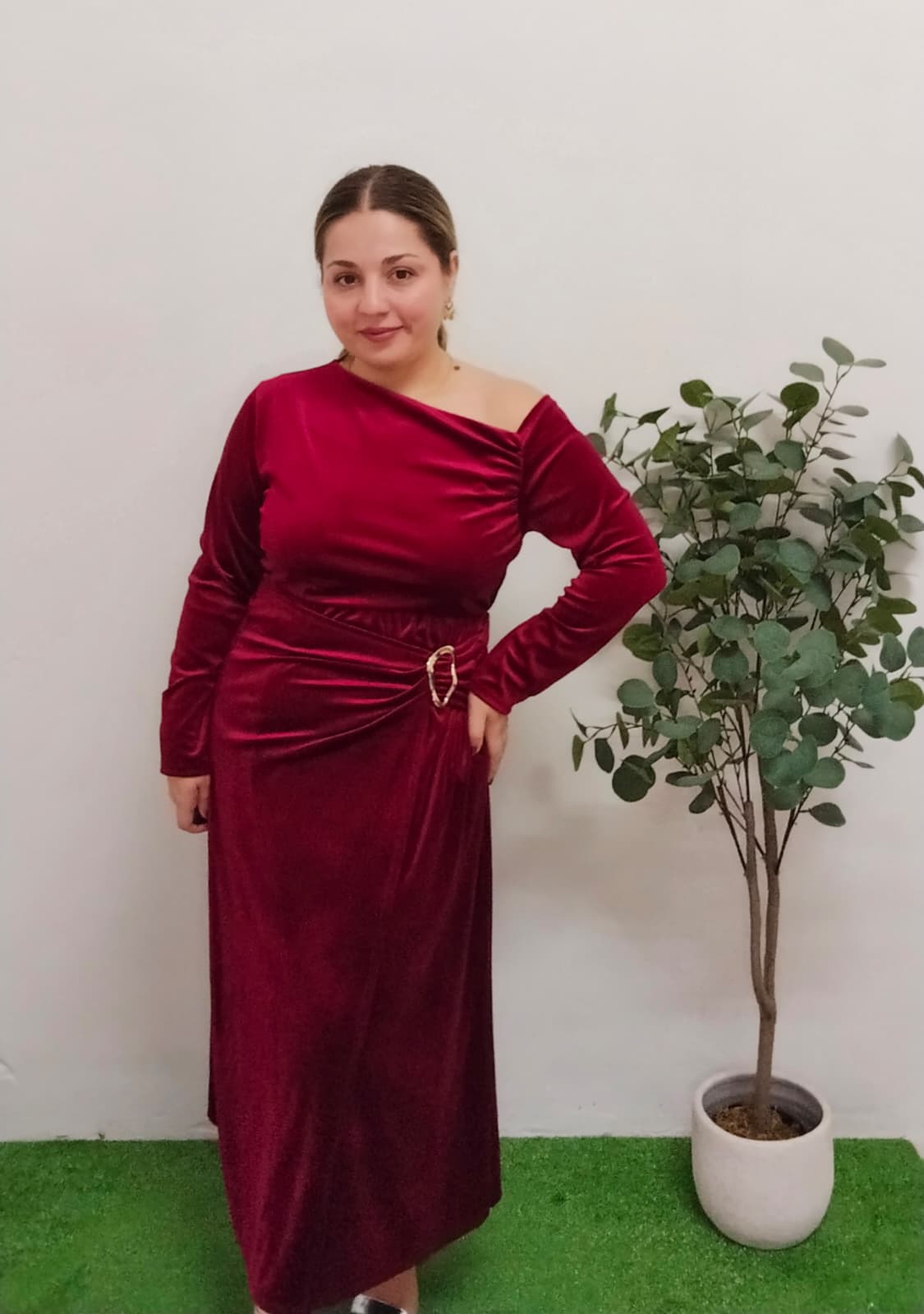 Preciosa falda de terciopelo en color rojo – vino tinto. Detalle metálico dorado en el lateral. Cintura elástica. Talla única, da bastante talla. Abarcaría desde la talla M hasta la talla XXL (38-44). ¡Llévate también la blusa a juego y crea tu conjunto ideal!