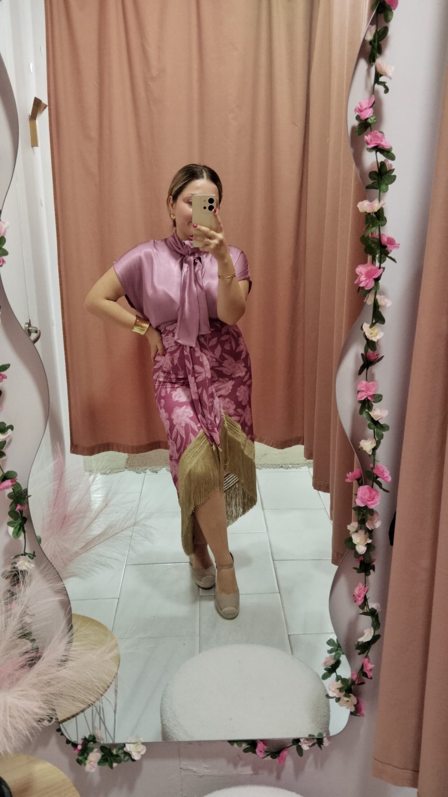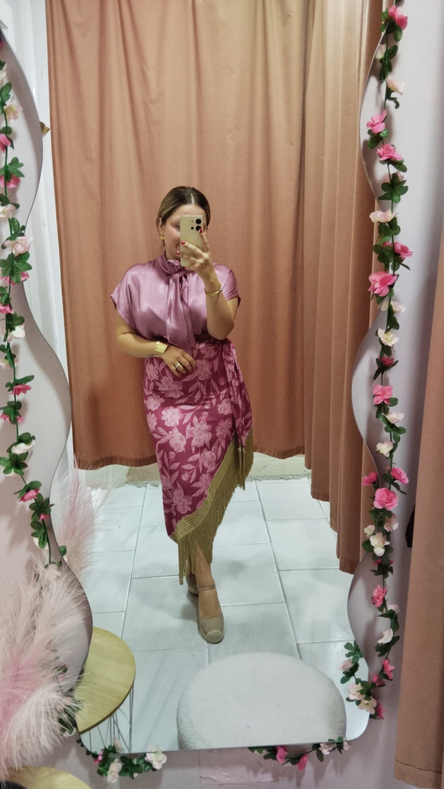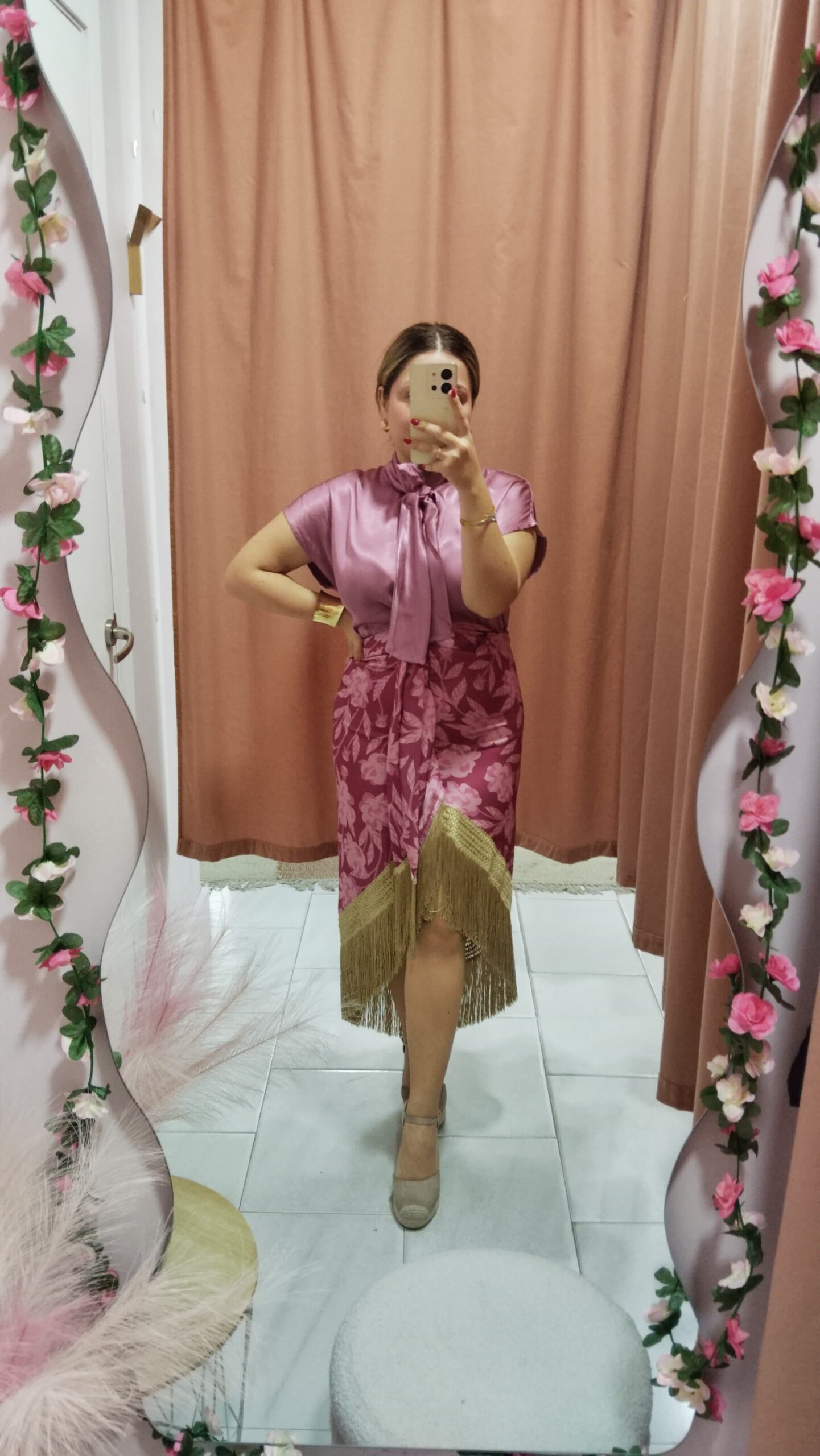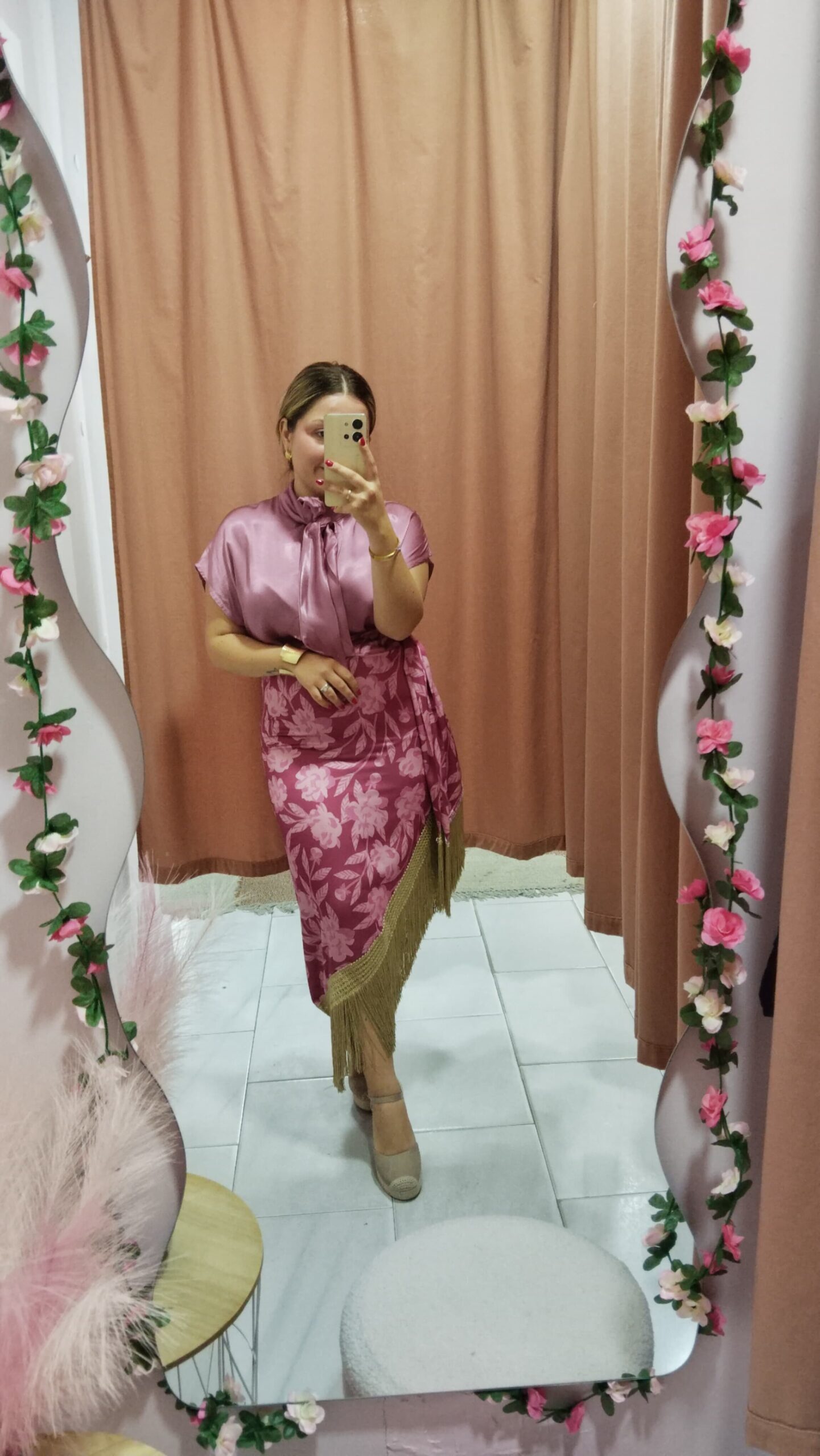 Falda corte midi efecto satinado con estampado en tono rosa empolvado. Flecos en tono dorado que dan mucho mivimiento al andar. Cierre con cremallera. Ideal para la feria. Talla única, abarcaría desde la talla S hasta la talla L (36-40). *Modelo usa habitualmente talla M*.