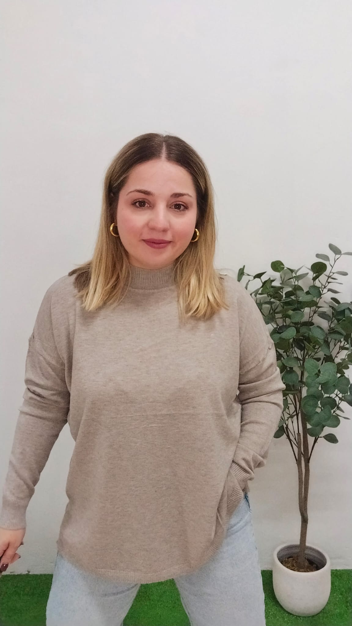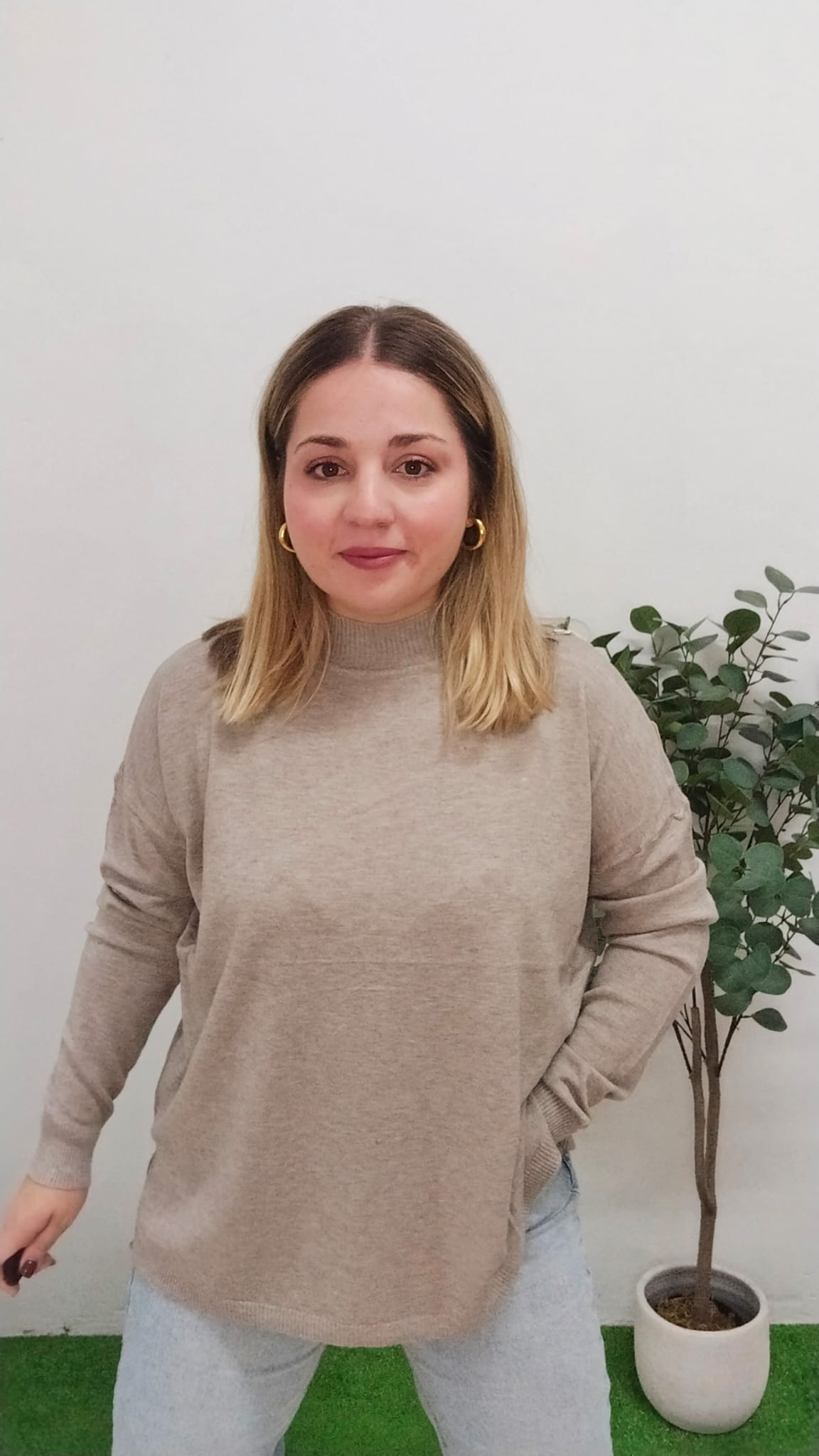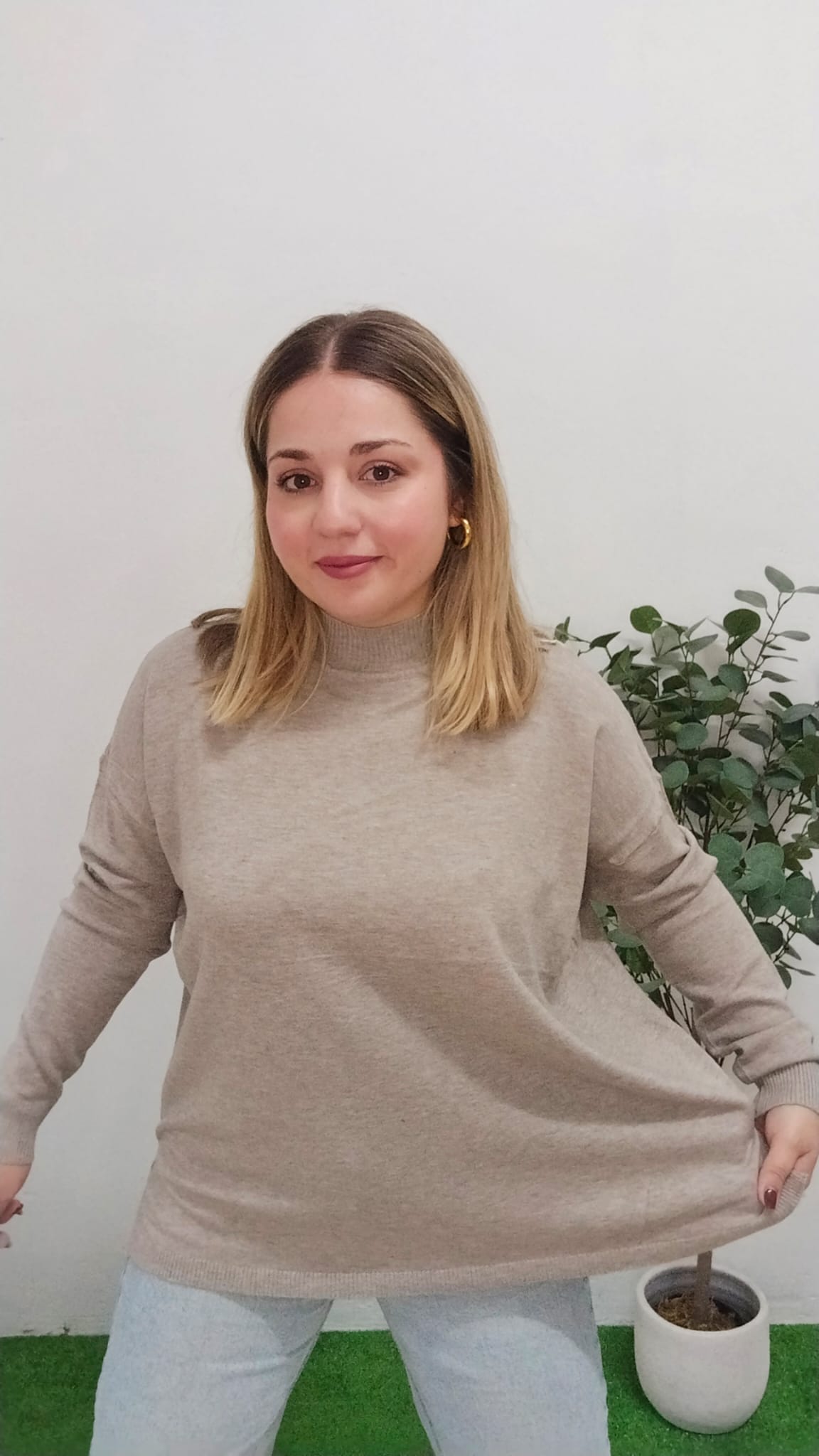 Precioso jersey en color topo. Cuello medio alto. Tejido muy suave y agradable, además de ser muy cómodo y calentito. Es talla única pero correspondería a una talla grande ya que, al tratarse de un tejido elástico, da bastante talla. Abarcaría desde la talla S hasta la talla XL/XXL (36-42/44). Si necesitas ayuda con las medidas, háblanos al 614265099.