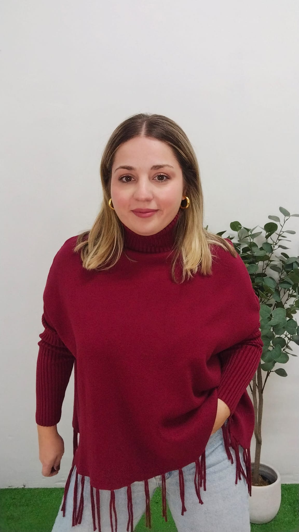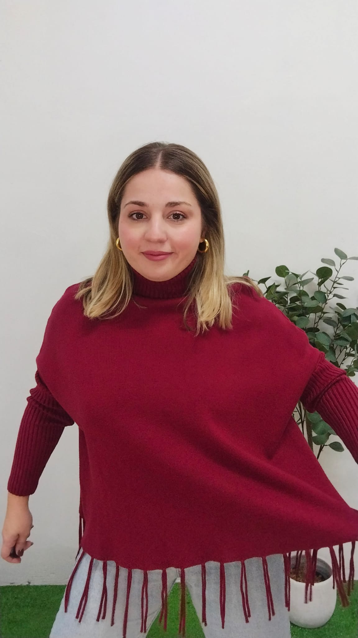 Jersey – poncho en color burdeos. Cuello alto y flecos. Tejido suave, agradable y muy elástico. Podría adaptarse a una talla grande, desde la S/M(36/38) hasta la XXL (44). Súper cómodo y calentito. Si necesitas ayuda con las medidas, háblanos al 614265099.