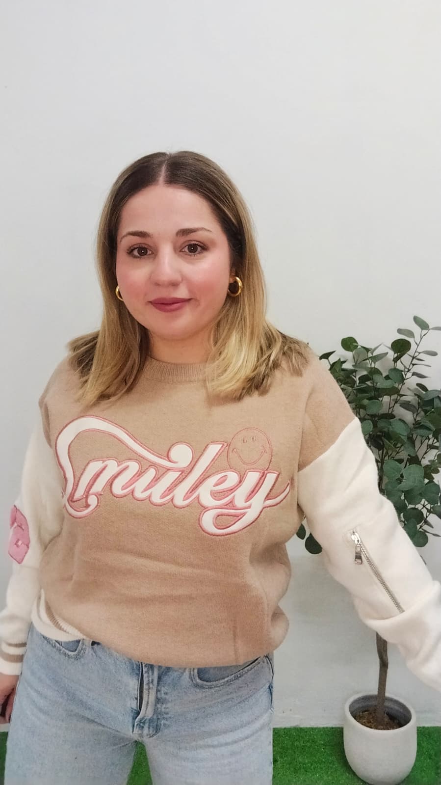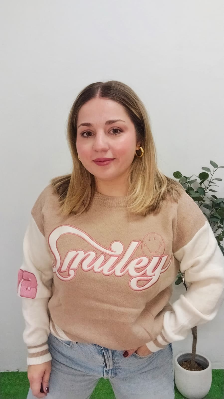 Jersey diseño Smiley en color camel y beige. Cuello redondo, tiene el detalle de la cremallera en la manga, inspiración sudadera. Tejido suave y agradable. Es muy cómodo y súper calentito. Al tratarse de un tejido elástico da bastante talla, abarcaría desde la talla S hasta la talla XL (36-42). Si necesitas ayuda con la talla, háblanos al 614265099. ¡Échale un vistazo a nuestro modelo Smiley con cremallera en nuestra web!