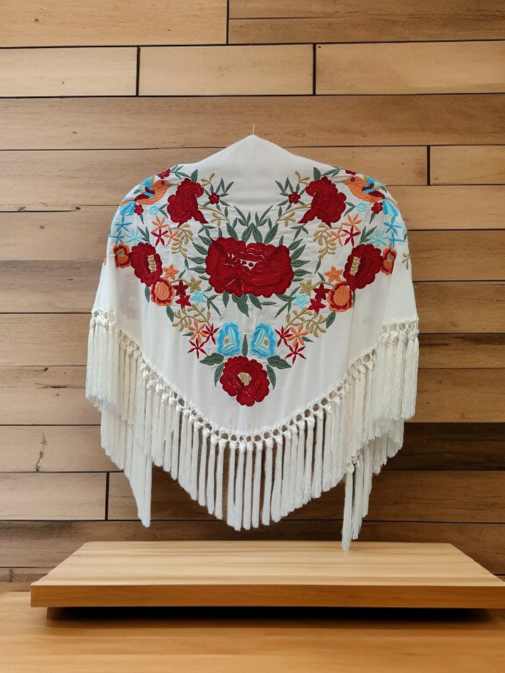 Precioso mantoncillo confeccionado en algodón y viscosa, un tejido suave y muy cómodo de llevar. Color blanco, bordado rojo y flecado a mano. Ideal para cualquier romería o feria. *Según el dispositivo desde el que estés visualizando nuestra web, los colores pueden verse ligeramente alterados*.