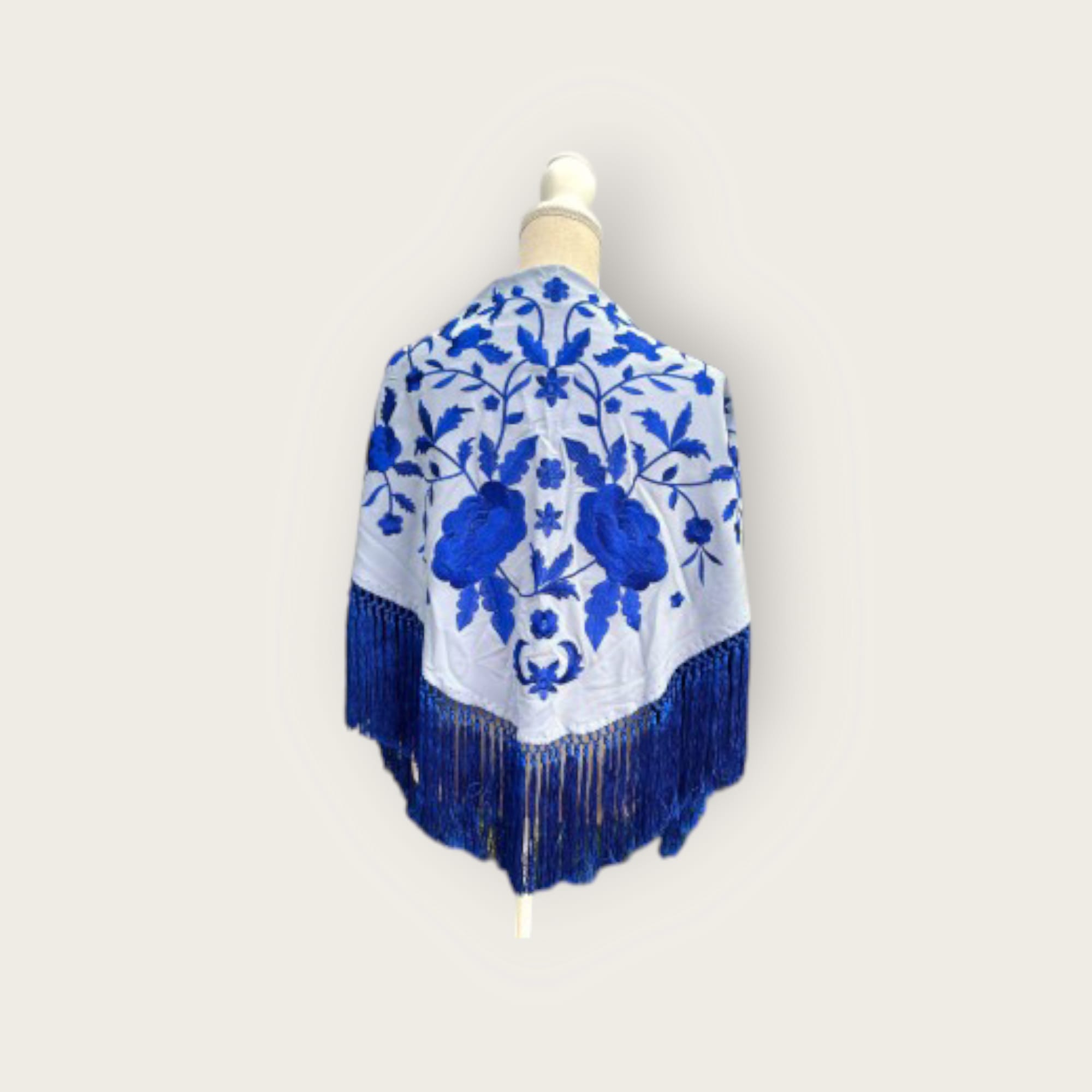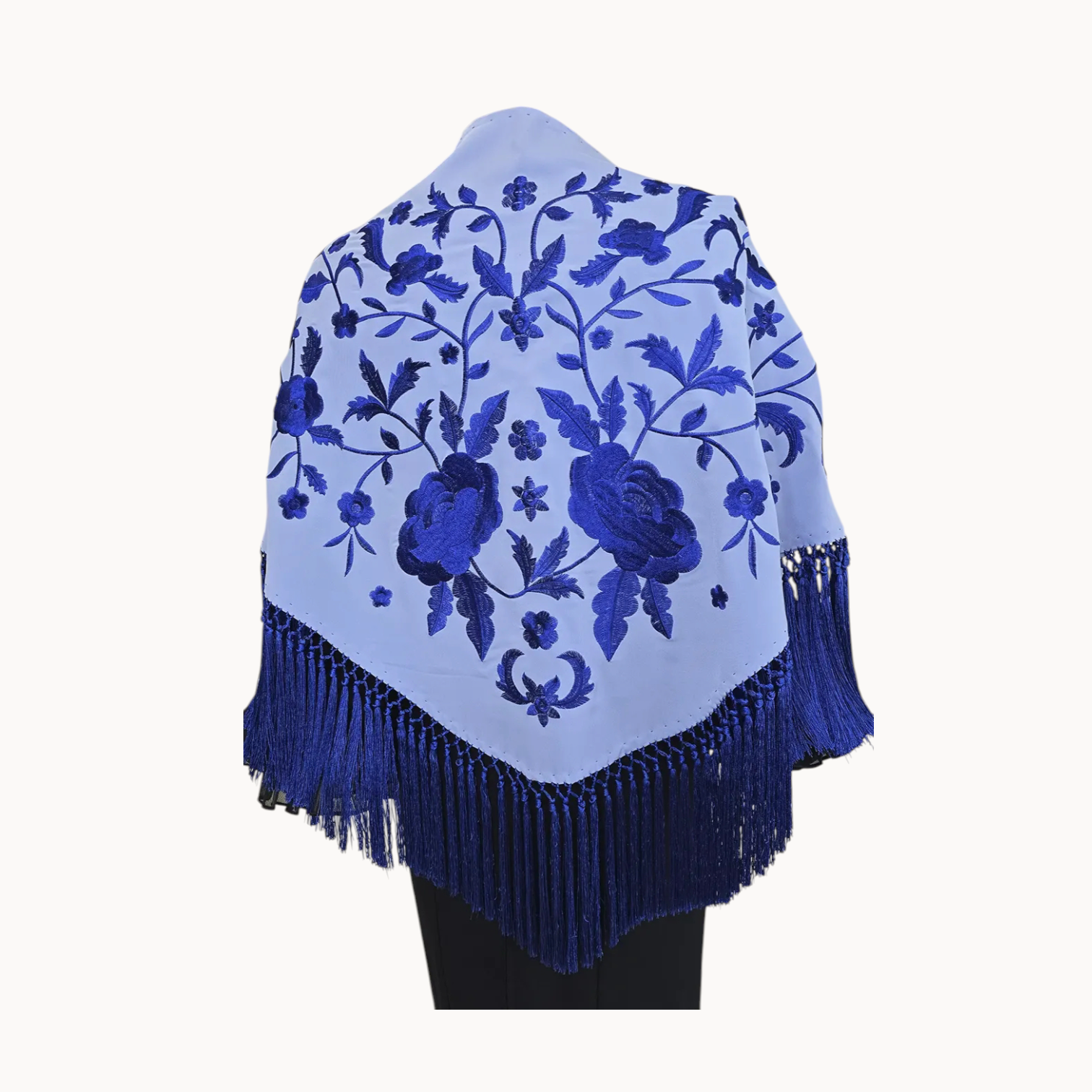 Precioso mantoncillo confeccionado en crespón de seda, un tejido suave y muy cómodo de llevar. Color celeste, bordado azulina – azul eléctrico, flecado a mano. Ideal para cualquier romería o feria. *Según el dispositivo desde el que estés visualizando nuestra web, los colores pueden verse ligeramente alterados*.