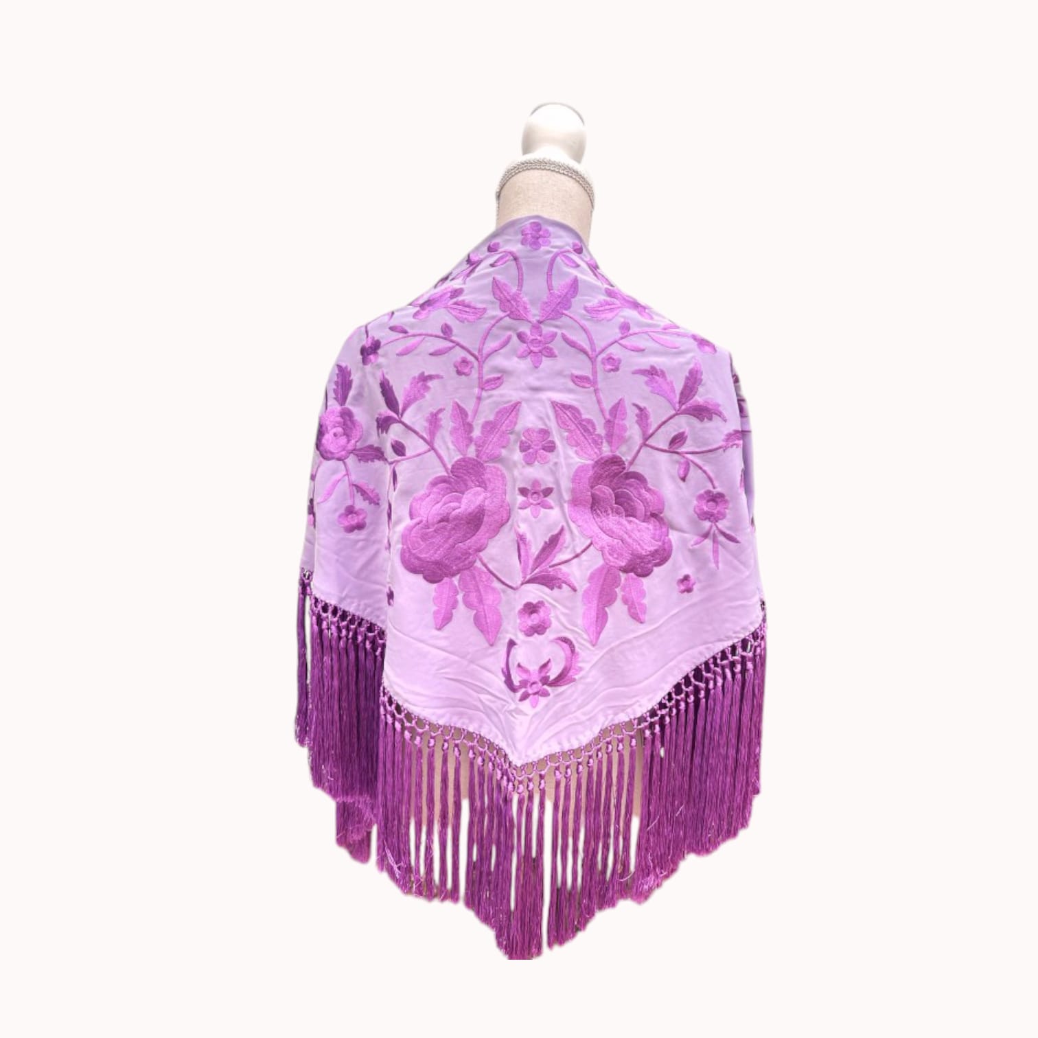 Precioso mantoncillo confeccionado en crespón de seda, un tejido suave y muy cómodo de llevar. Color lila bordado a tono, flecado a mano. Ideal para cualquier romería o feria. *Según el dispositivo desde el que estés visualizando nuestra web, los colores pueden verse ligeramente alterados*.