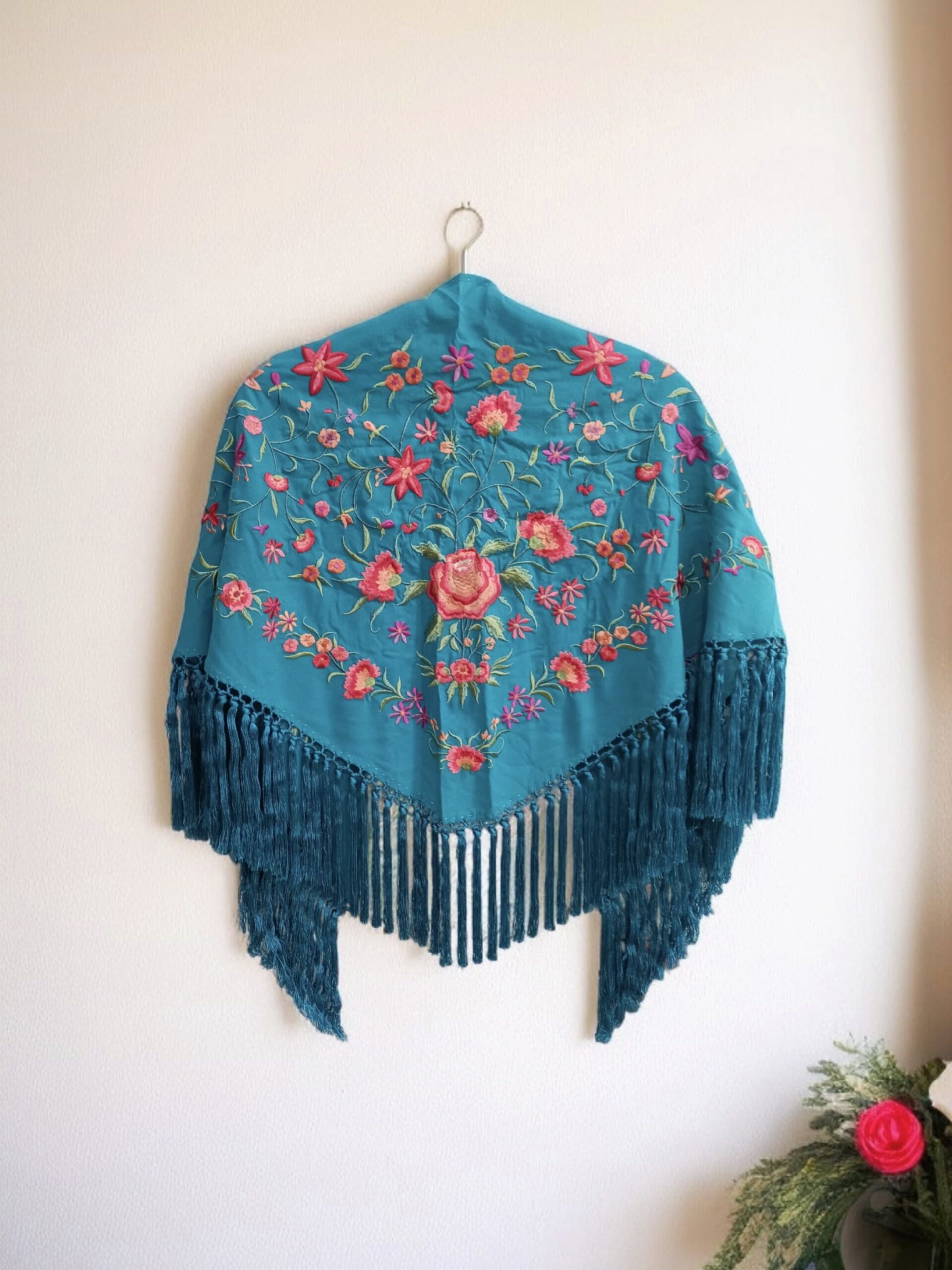 Precioso mantoncillo confeccionado en crespón,tejido muy cómodo de llevar. Color turquesa, bordado rojo(suave) y flecado a mano. Ideal para cualquier romería o feria. *Según el dispositivo desde el que estés visualizando nuestra web, los colores pueden verse ligeramente alterados*.
