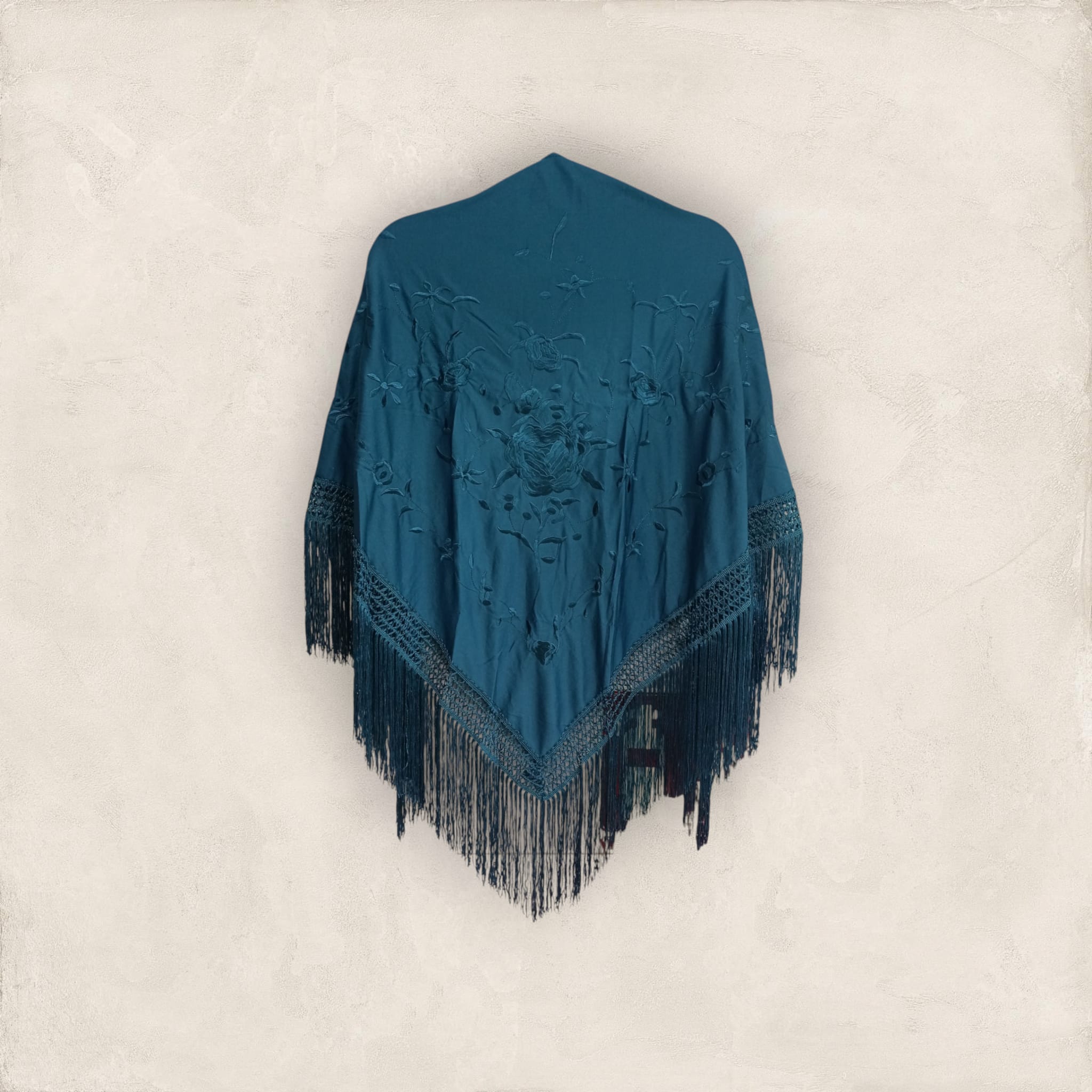 Mantoncillo de pico low cost. Color azul petróleo con bordado al tono. Ideal para lucirlo de todas las formas con tu traje o bata flamenca: clásico, cruzado…