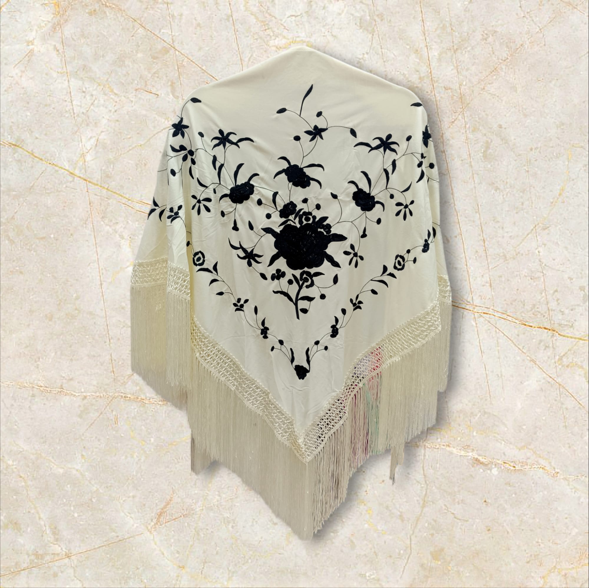 Mantoncillo de pico low cost. Color beige bordado en negro. Ideal para lucirlo de todas las formas con tu traje o bata flamenca: clásico, cruzado…