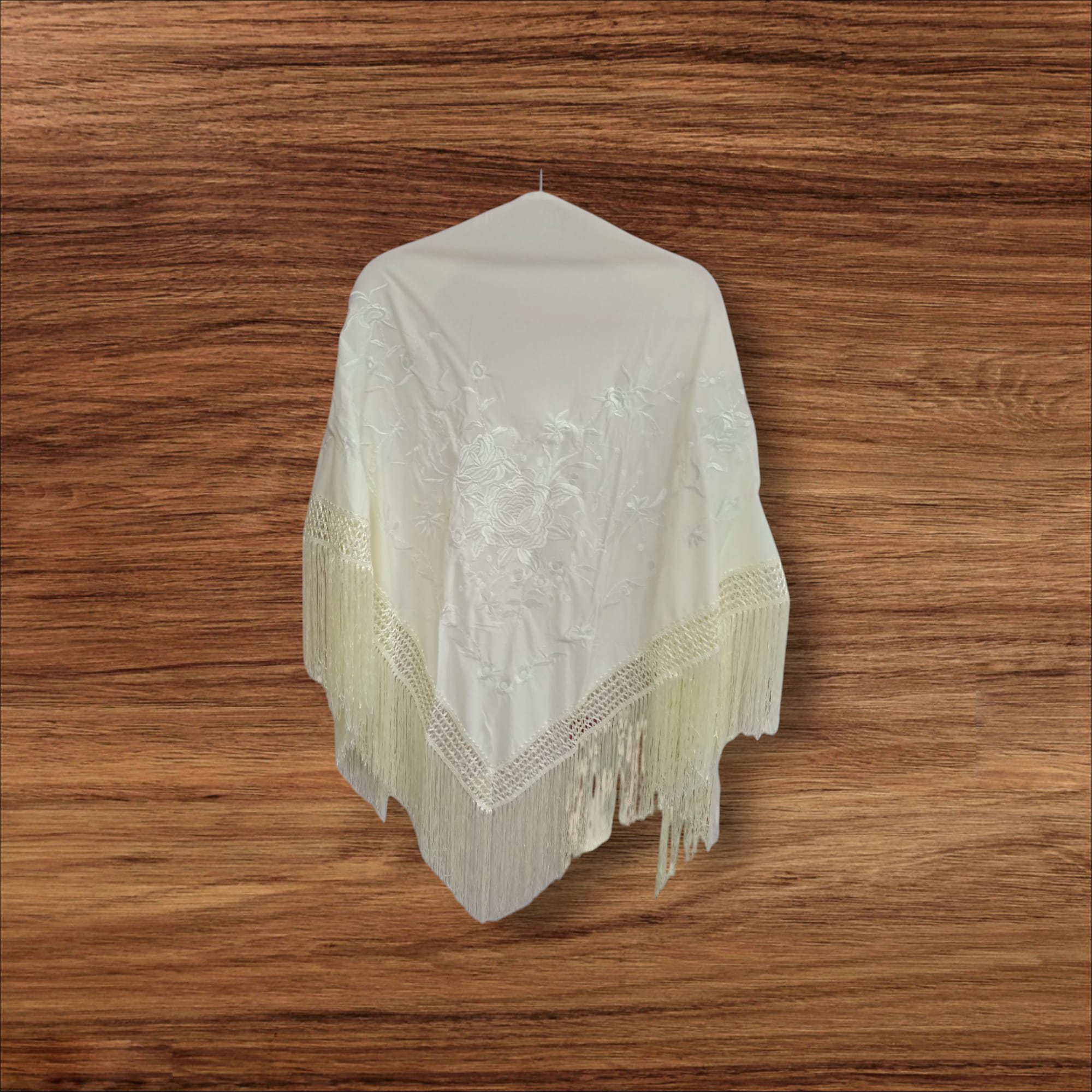 Mantoncillo de pico low cost. Color beige (crema) con bordado en color blanco (clarito). Ideal para lucirlo de todas las formas con tu traje o bata flamenca: clásico, cruzado…