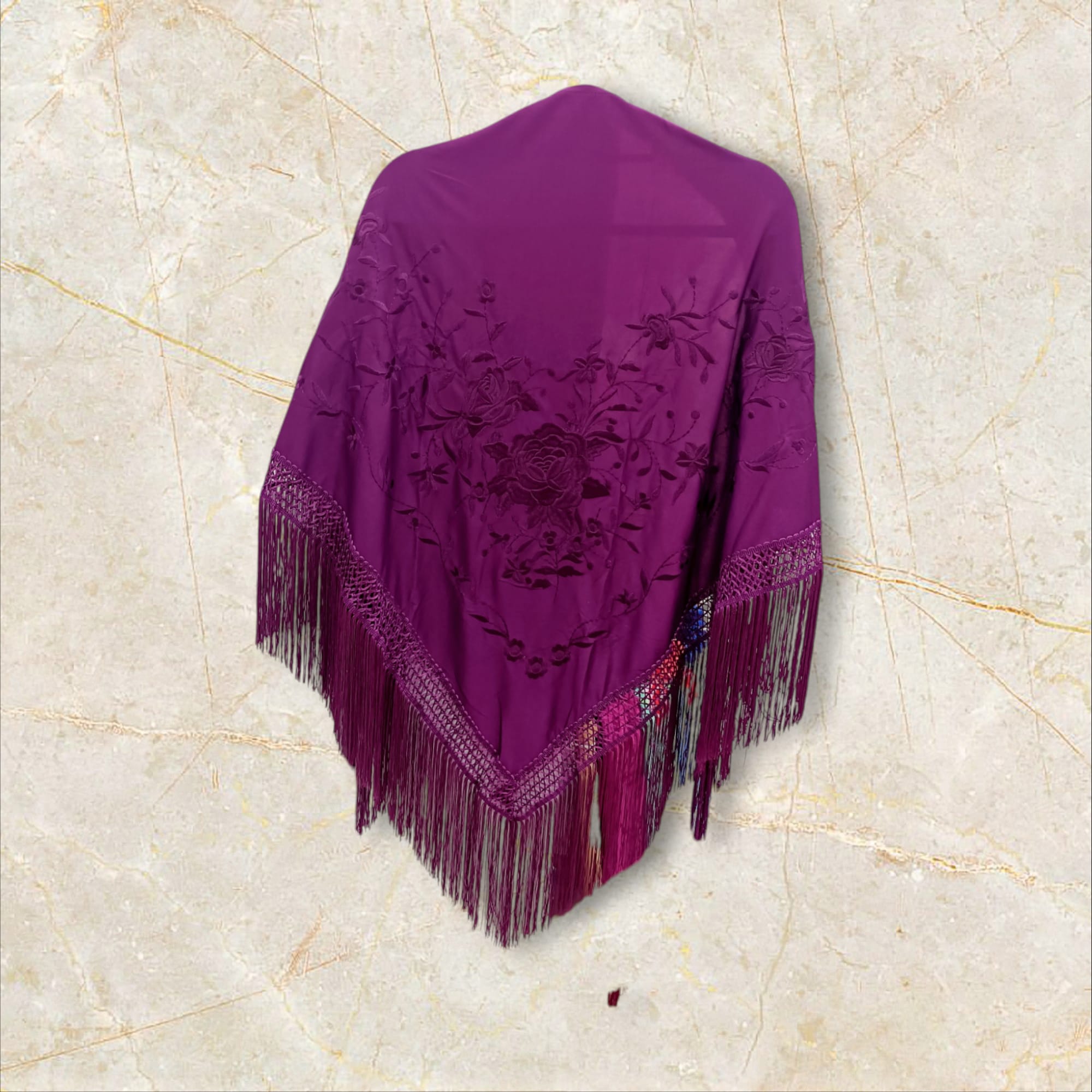 Mantoncillo de pico low cost. Color berenjena bordado a tono. deal para lucirlo de todas las formas con tu traje o bata flamenca: clásico, cruzado…