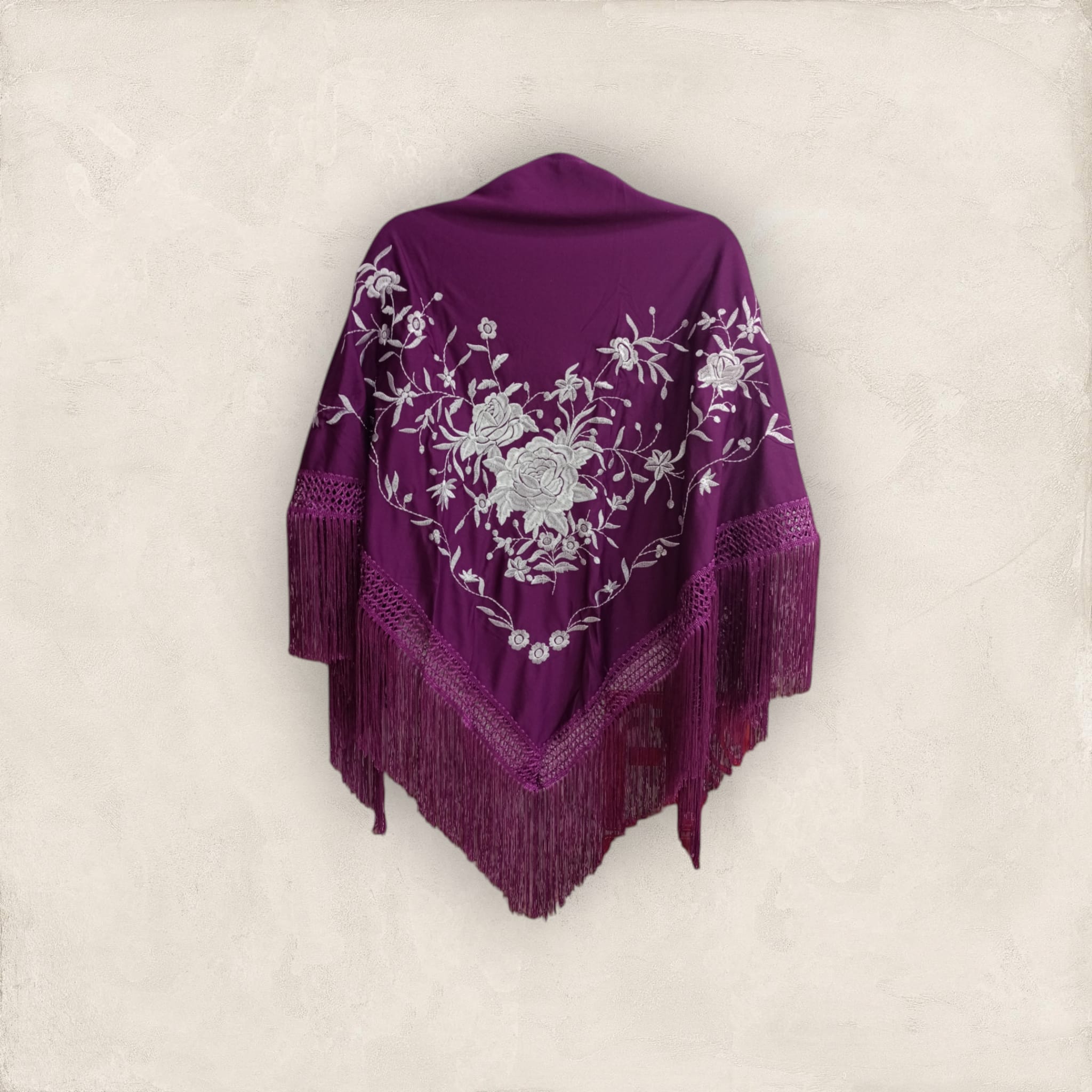 Mantoncillo de pico low cost. Color berenjena con bordado en color plata. Ideal para lucirlo de todas las formas con tu traje o bata flamenca: clásico, cruzado…