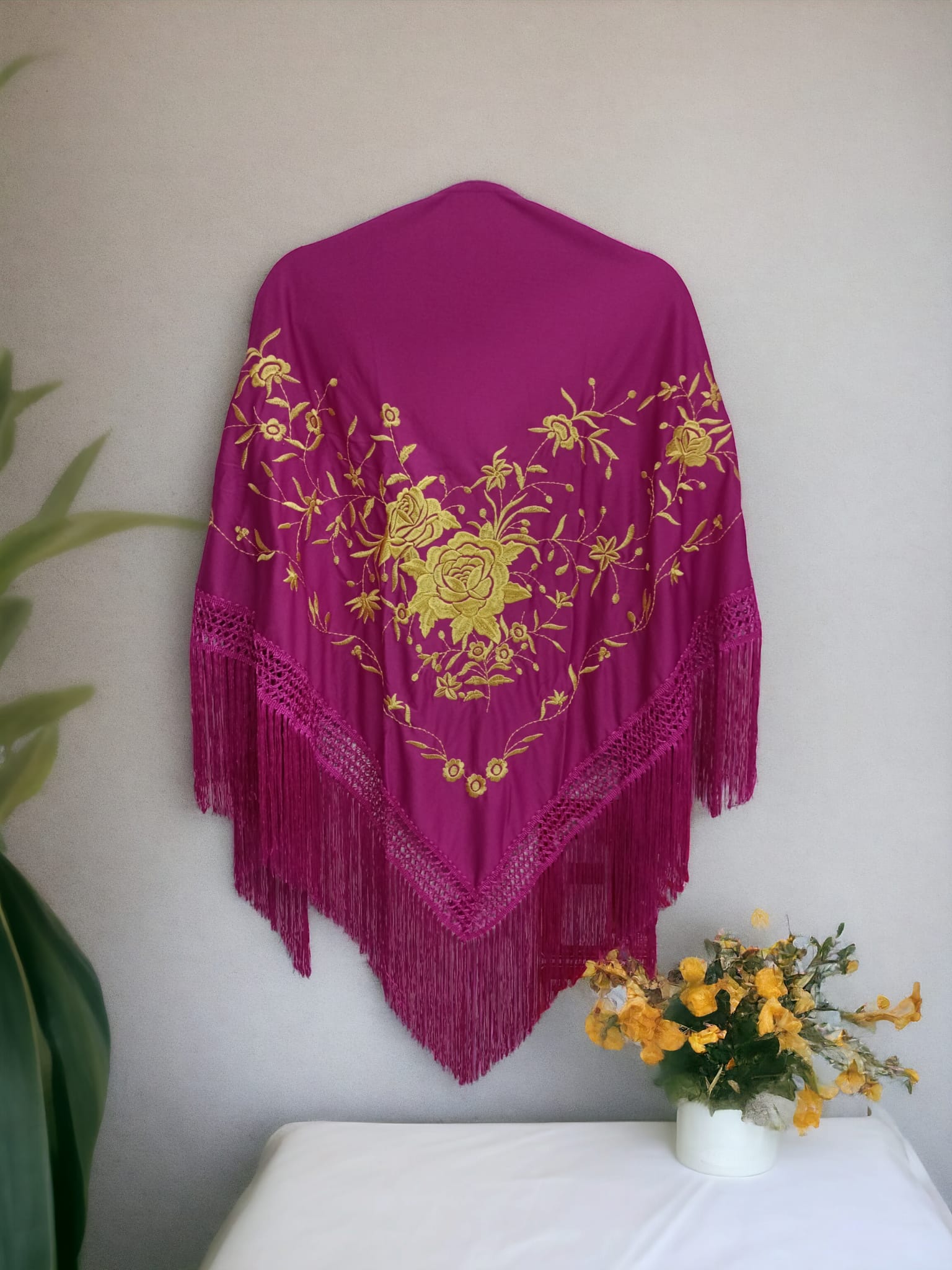 Mantoncillo de pico low cost. Color buganvilla con bordado en dorado. Ideal para lucirlo de todas las formas con tu traje o bata flamenca: clásico, cruzado…