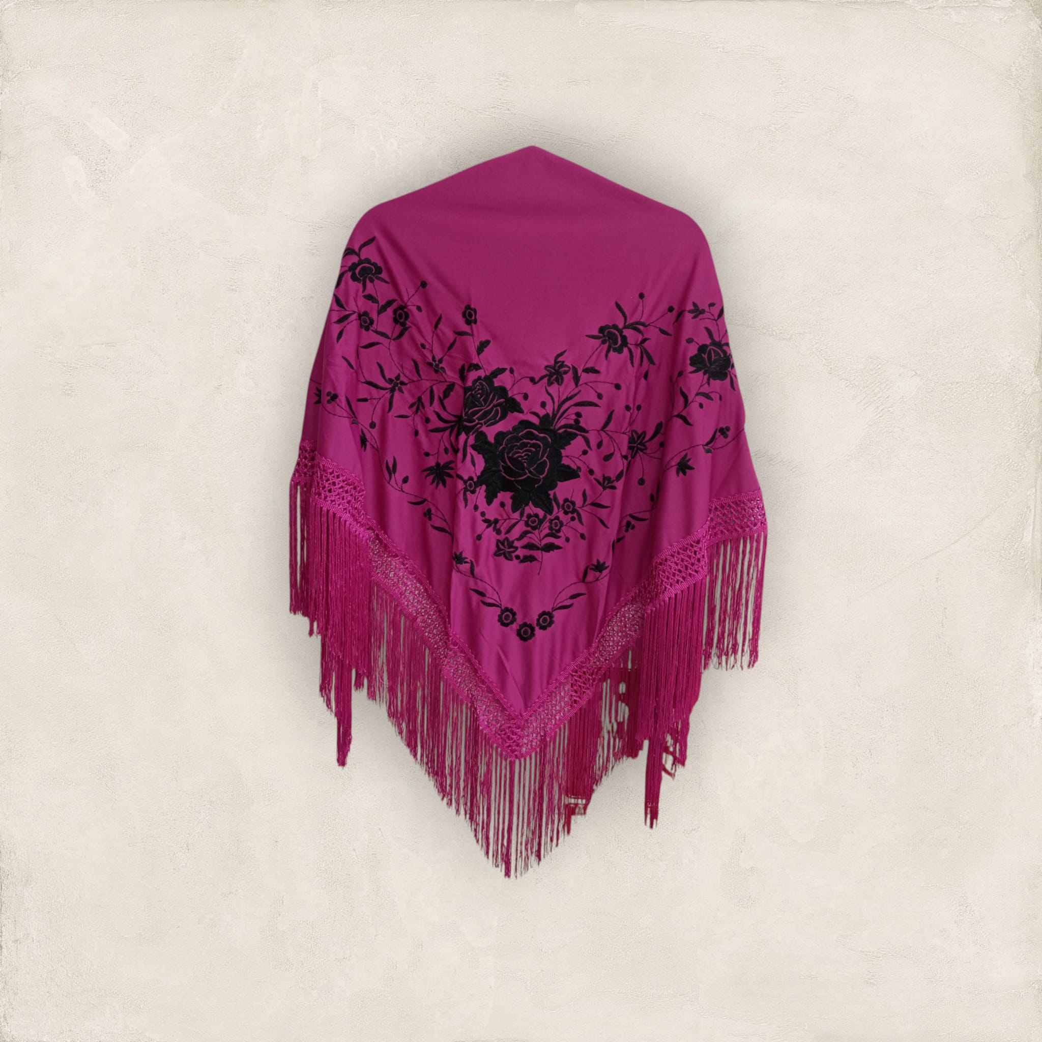 Mantoncillo de pico low cost. Color buganvilla con bordado en color negro. Ideal para lucirlo de todas las formas con tu traje o bata flamenca: clásico, cruzado…