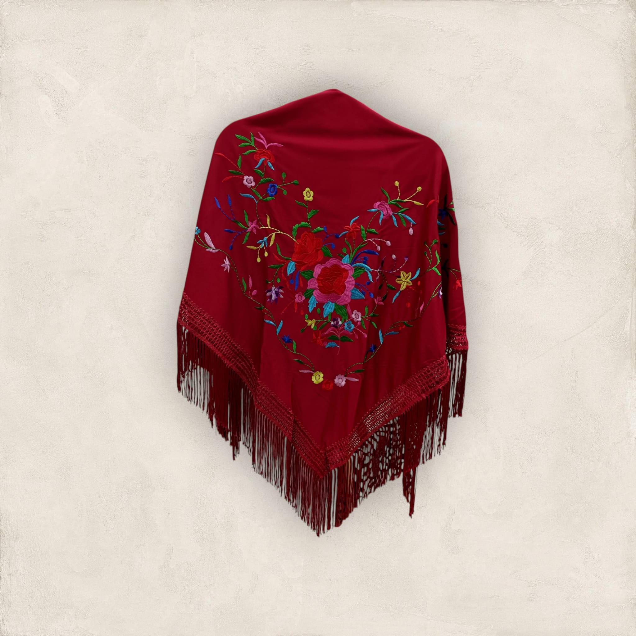Mantoncillo de pico low cost. Color burdeos con bordado de colores. Ideal para lucirlo de todas las formas con tu traje o bata flamenca: clásico, cruzado…