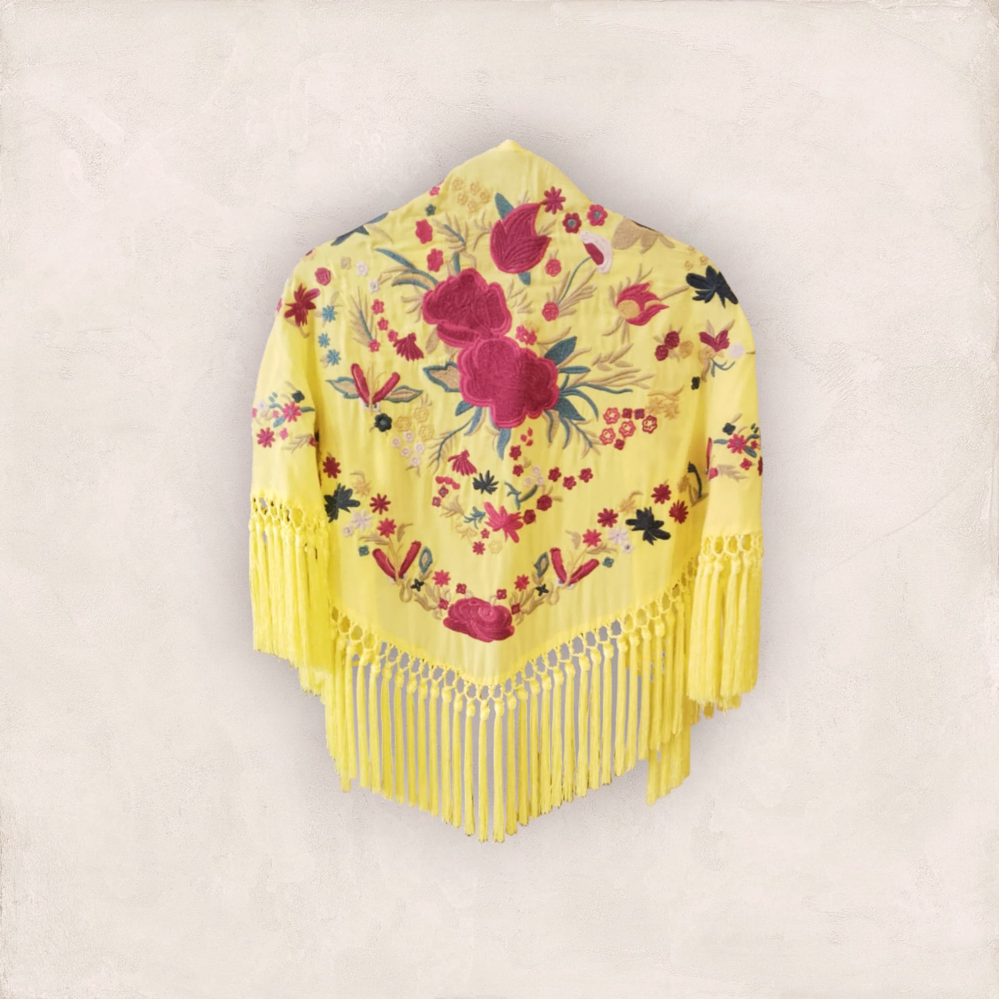 Precioso mantoncillo confeccionado en algodón y viscosa, un tejido suave y muy cómodo de llevar. Color amarillo limón, bordado buganvilla y flecado a mano con hilo de seda. Ideal para cualquier romería o feria. *Según el dispositivo desde el que estés visualizando nuestra web, los colores pueden verse ligeramente alterados*.
