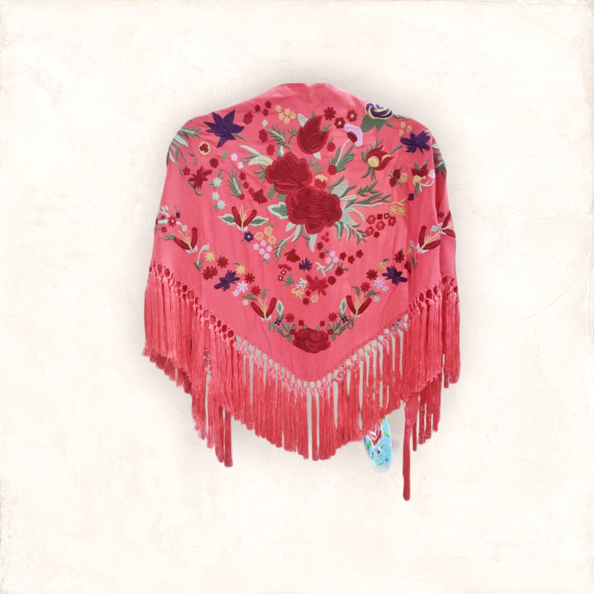 Precioso mantoncillo confeccionado en algodón y viscosa, un tejido suave y muy cómodo de llevar. Color rosa coral bordado rojo y flecado a mano con hilo de seda. Ideal para cualquier romería o feria. *Según el dispositivo desde el que estés visualizando nuestra web, los colores pueden verse ligeramente alterados*.