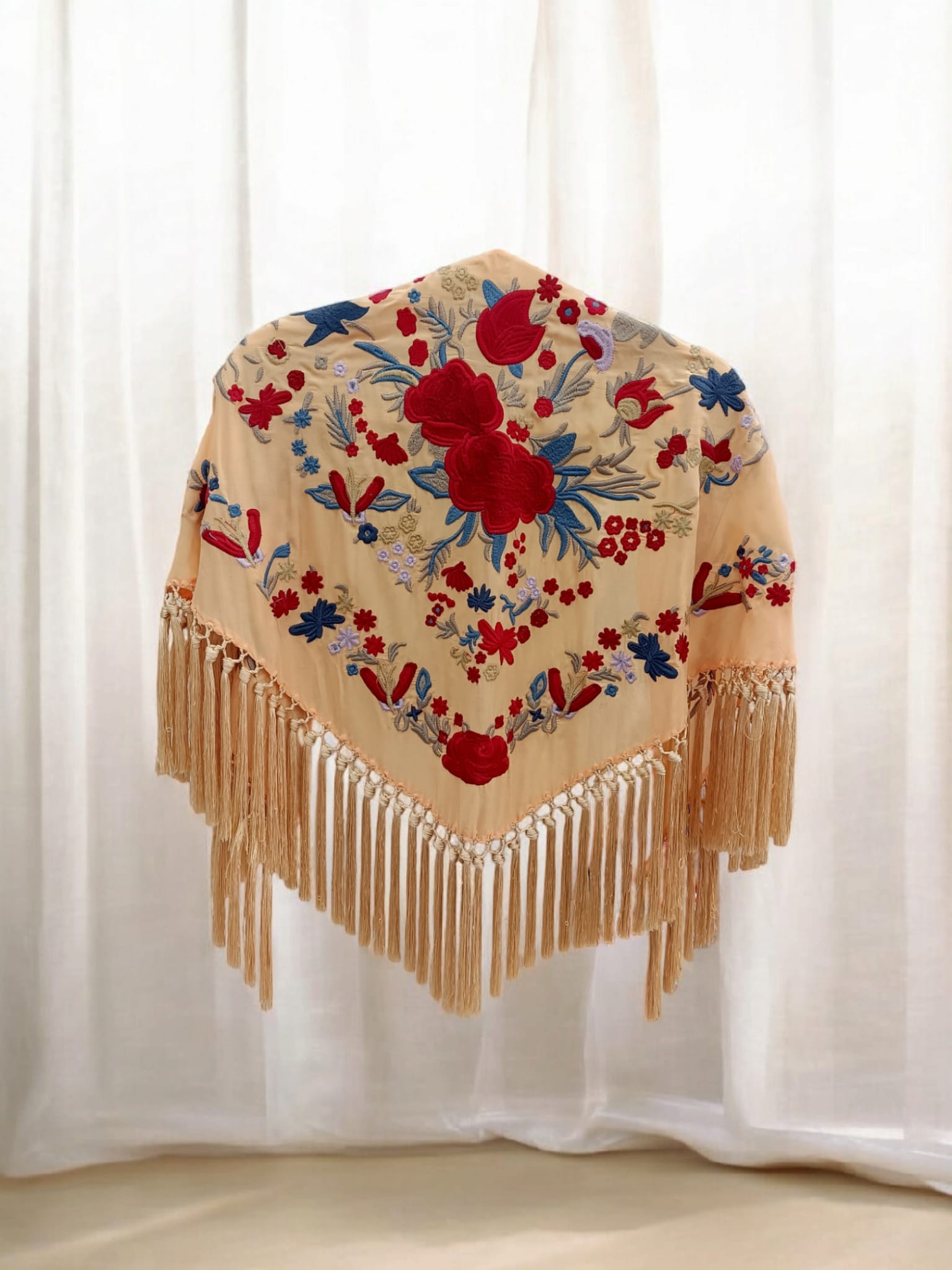Precioso mantoncillo confeccionado en algodón y viscosa, un tejido suave y muy cómodo de llevar. Color vainilla, bordado rojo y flecado a mano con hilo de seda. Ideal para cualquier romería o feria. *Según el dispositivo desde el que estés visualizando nuestra web, los colores pueden verse ligeramente alterados*.