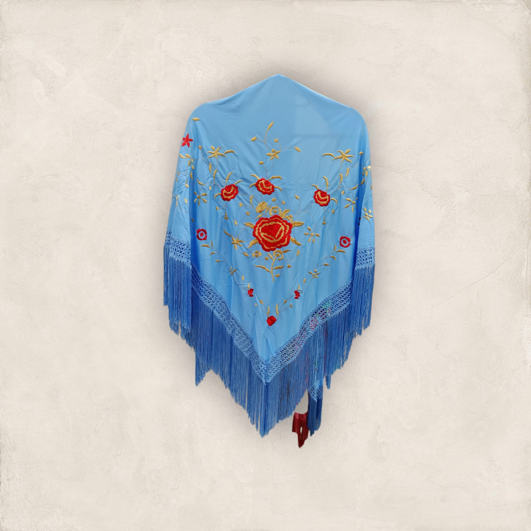 Mantoncillo de pico low cost. Color celeste con bordado rojo y dorado. Ideal para lucirlo de todas las formas con tu traje o bata flamenca: clásico, cruzado…