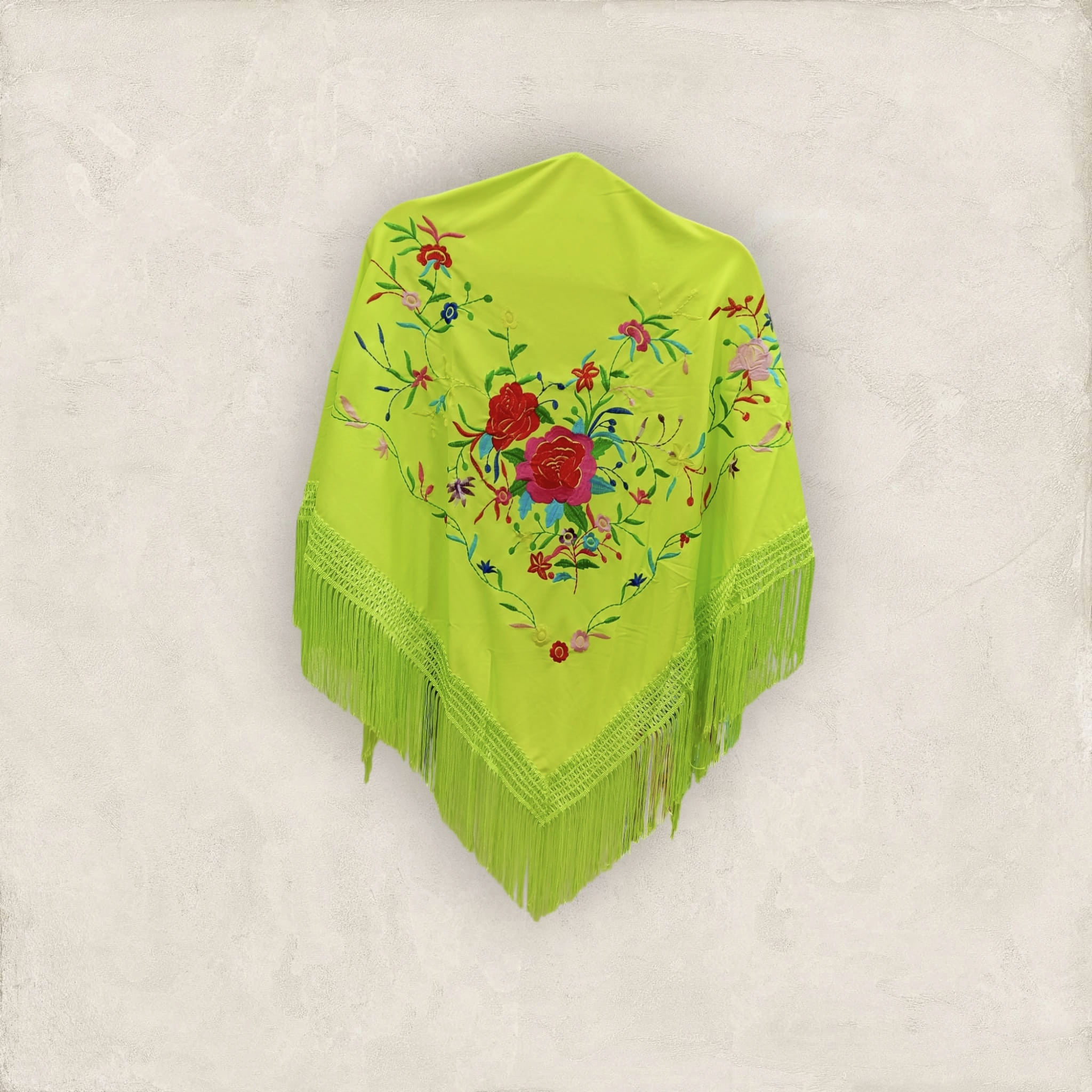 Mantoncillo de pico low cost. Color lima con bordado de colores. Ideal para lucirlo de todas las formas con tu traje o bata flamenca: clásico, cruzado…