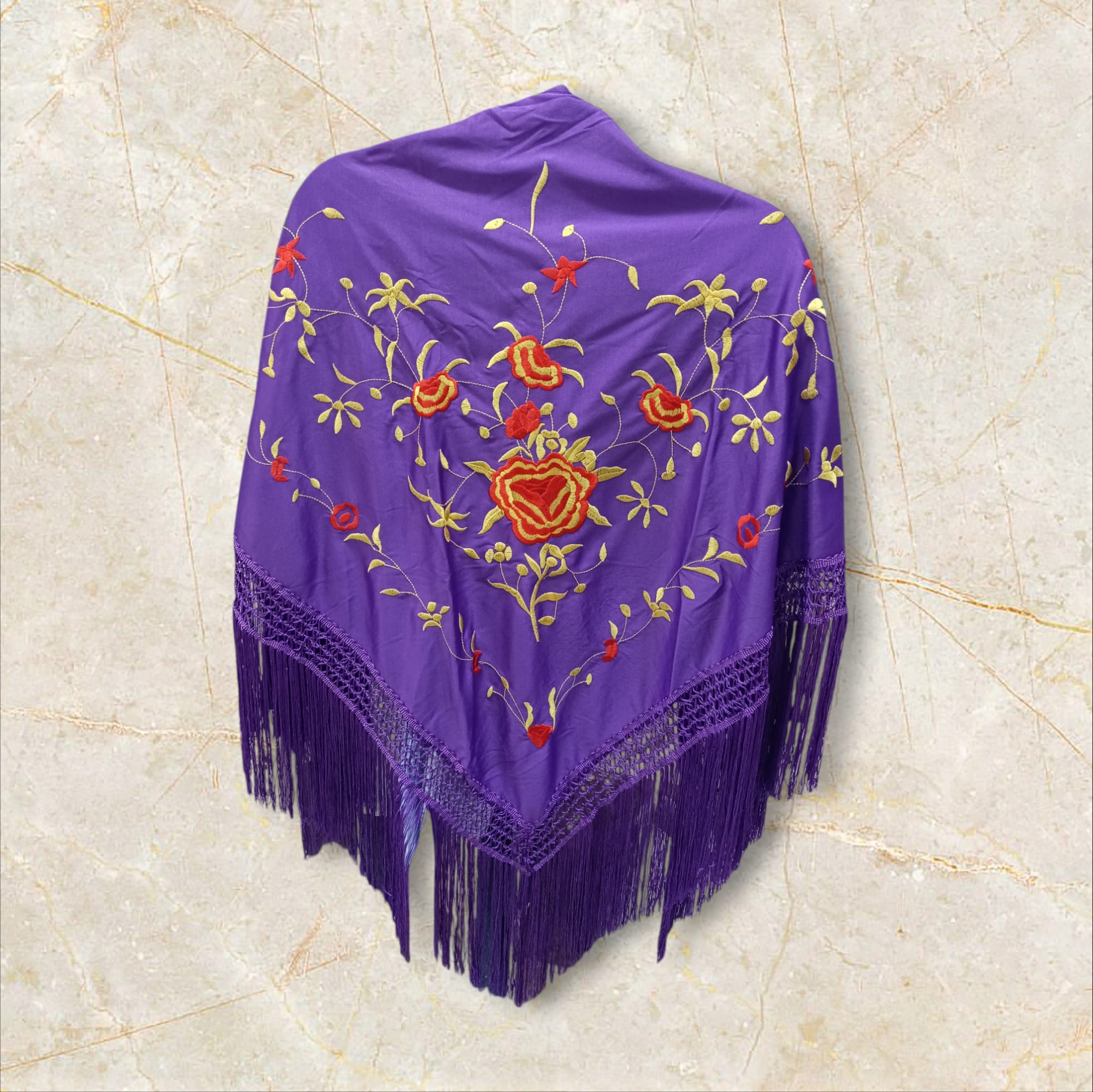 Mantoncillo de pico low cost. Color morado con bordado en rojo y dorado. Ideal para lucirlo de todas las formas con tu traje o bata flamenca: clásico, cruzado…