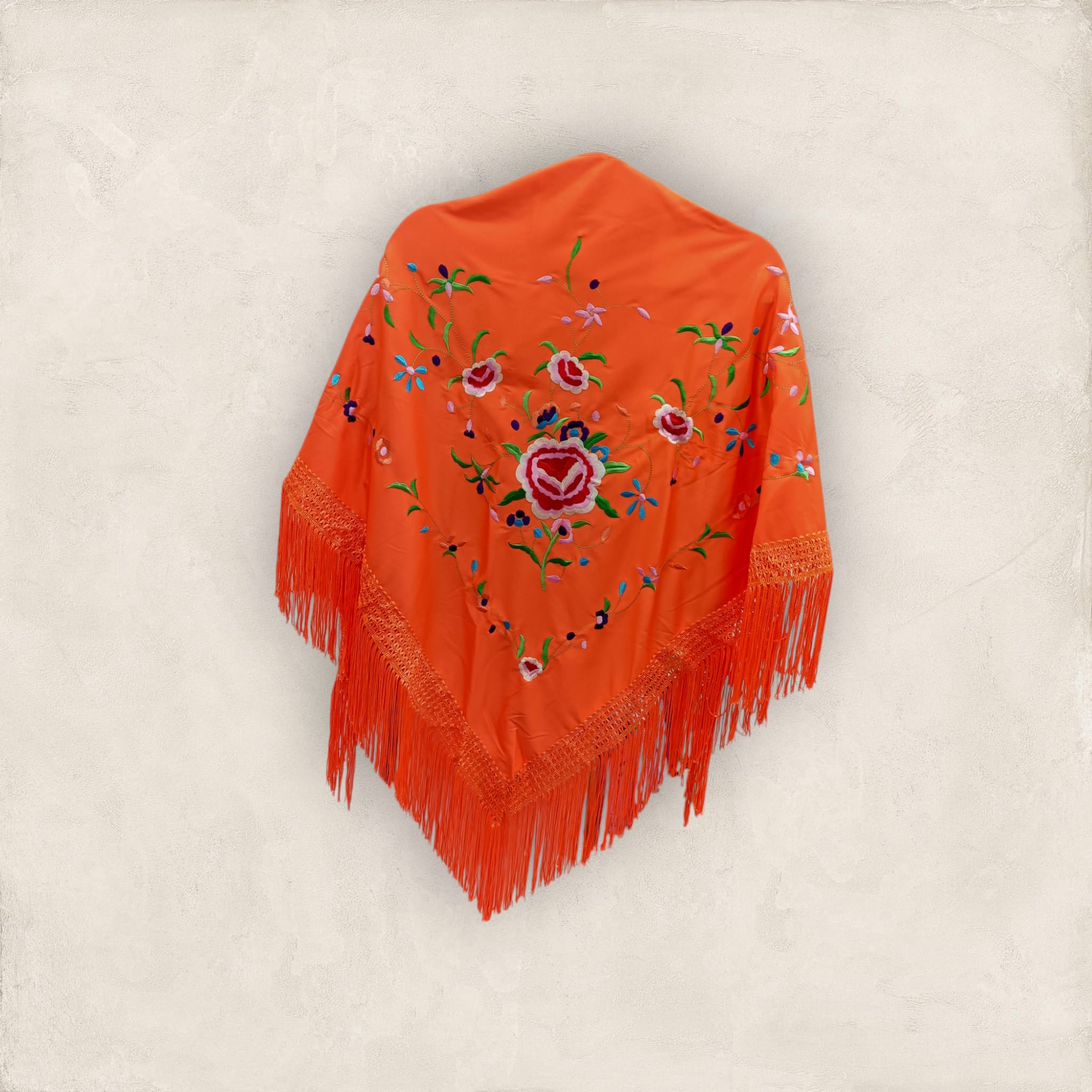 Mantoncillo de pico low cost. Color naranja con bordado de colores. Ideal para lucirlo de todas las formas con tu traje o bata flamenca: clásico, cruzado…
