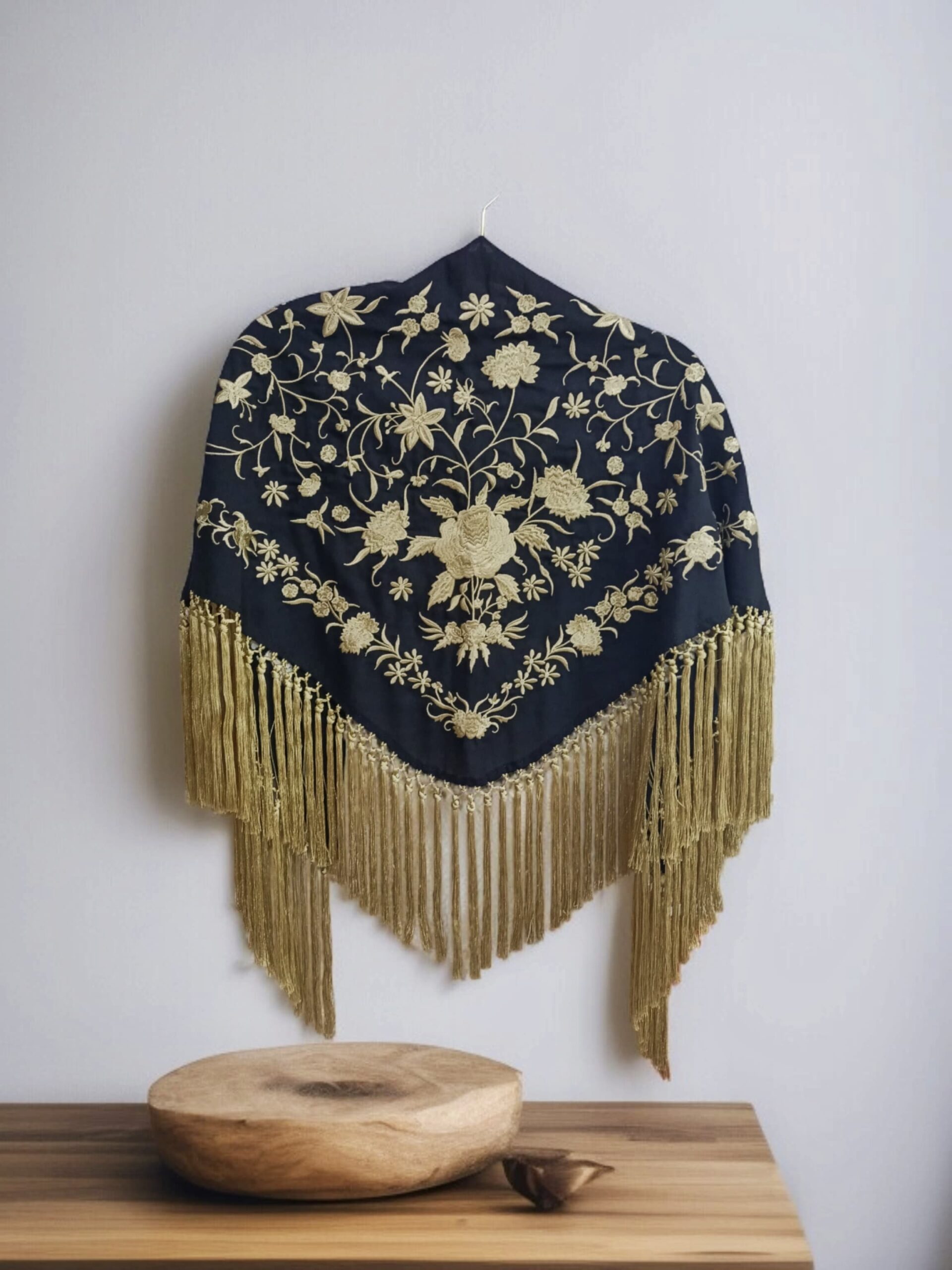 Precioso mantoncillo confeccionado en crespón,tejido muy cómodo de llevar. Color negro, bordado dorado y flecado a mano. Ideal para cualquier romería o feria. *Según el dispositivo desde el que estés visualizando nuestra web, los colores pueden verse ligeramente alterados*.