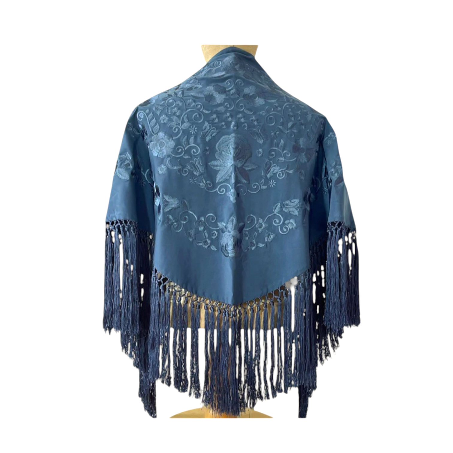 Precioso mantoncillo confeccionado en crespón de seda, un tejido suave y muy cómodo de llevar. Color azul ducado, bordado a tono y flecado a mano. Ideal para cualquier romería o feria. *Según el dispositivo desde el que estés visualizando nuestra web, los colores pueden verse ligeramente alterados*.